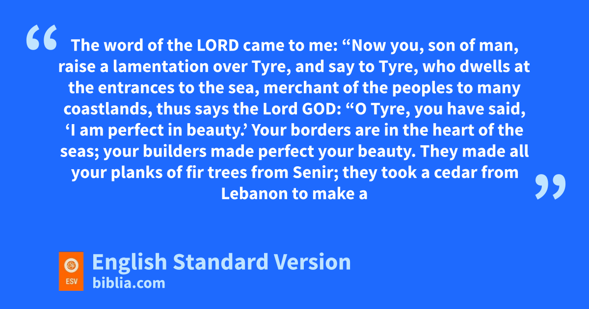 27 The word of the Lord came to me: 2 “Now you, tson of man, uraise a lamentation over Tyre, 3 and say to Tyre, who dwells at vthe entrances to the sea, wmerchant of the peoples to many coastlands, thus says the Lord God: