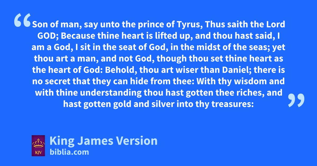 28 The word of the Lord came again unto me, saying, 2 Son of man, say unto athe prince of Tyrus, Thus saith the Lord God; bBecause cthine heart is lifted up, and dthou hast said, I am a God, I sit in the seat of God, ein the †midst of the seas; yet fthou art a man, and not God, though gthou set thine heart as the heart of God: 3 Behold, hthou art wiser than iDaniel; there is no secret that they can hide from thee: 4 hjWith thy wisdom and with thine understanding kthou hast gotten thee riches, and hast gotten gold and silver into thy treasures: 5 †By thy great wisdom and by lthy traffick khast thou increased thy riches, and cmthine heart is lifted up because of thy riches: 6 Therefore thus saith the Lord God; Because gthou hast set thine heart as the heart of God; 7 Behold, therefore I will bring nstrangers upon thee, opthe terrible of the nations: and othey shall draw their swords against qthe beauty of thy wisdom, and they shall defile qthy brightness. 8 They shall bring thee down rto the pit, and thou shalt die the deaths of them that are slain ein the midst of the seas. 9 dWilt thou yet say before him that slayeth thee, I am God? but fthou shalt be a man, and no God, in the hand of him that ||slayeth thee. 10 Thou shalt die the deaths of sthe uncircumcised by the hand of nstrangers: for tI have spoken it, saith the Lord God.