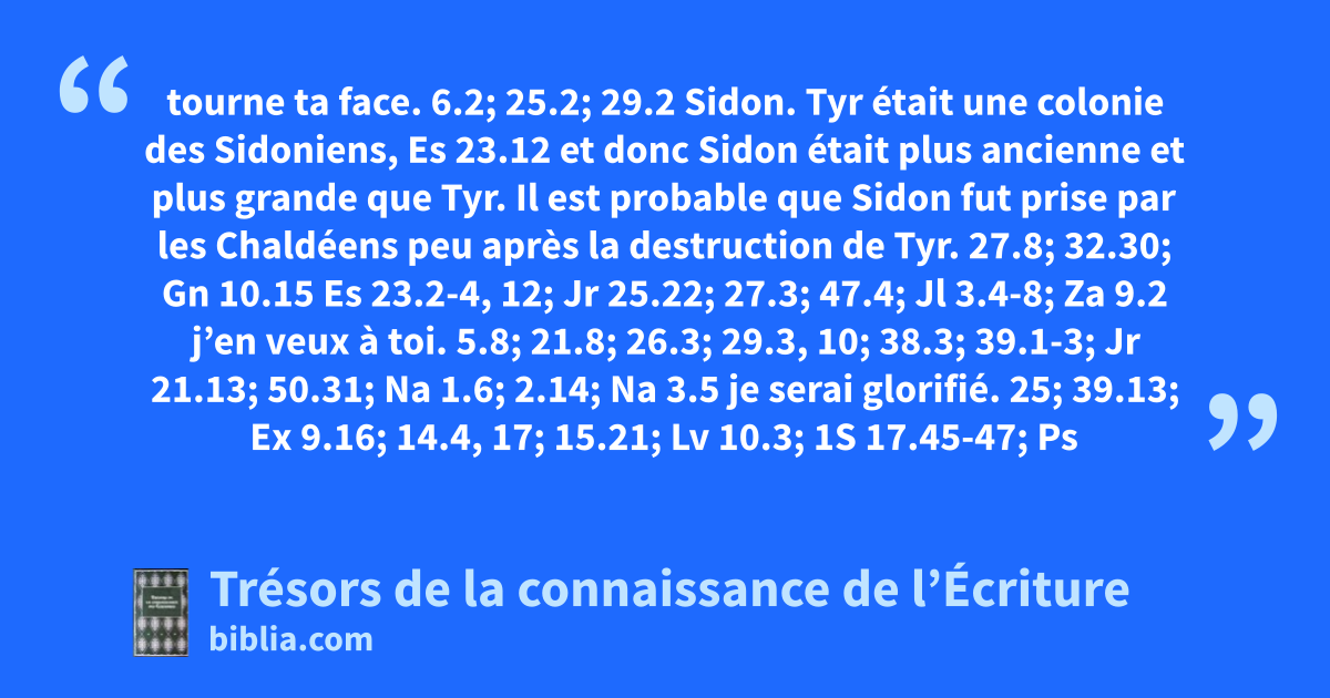 tourne ta face. 6.2; 25.2; 29.2 Sidon. Tyr était une colonie des Sidoniens, Es 23.12 et donc Sidon était plus ancienne et plus grande que Tyr. Il est probable que Sidon fut prise par les Chaldéens peu après la destruction de Tyr. 27.8; 32.30; Gn 10.15 Es 23.2-4, 12; Jr 25.22; 27.3; 47.4; Jl 3.4-8; Za 9.2