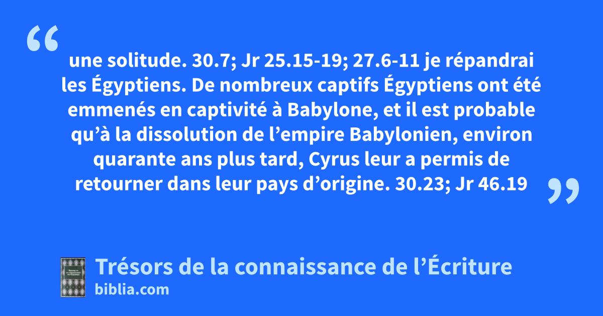 une solitude. 30.7; Jr 25.15-19; 27.6-11 je répandrai les Égyptiens. De nombreux captifs Égyptiens ont été emmenés en captivité à Babylone, et il est probable qu’à la dissolution de l’empire Babylonien, environ quarante ans plus tard, Cyrus leur a permis de retourner dans leur pays d’origine. 30.23; Jr 46.19