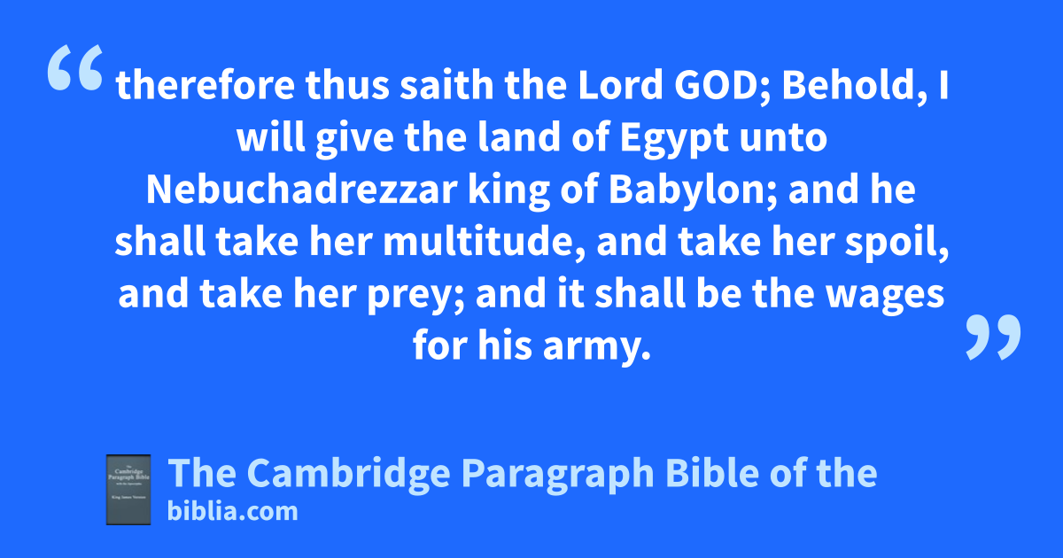 17 * And it came to pass in the seven and twentieth year, in the first month, in the first day of the month, the word of the Lord came unto me, saying, 18 Son of man, fNebuchadrezzar king of Babylon gcaused his army to serve a great service hagainst Tyrus: every head was made bald, and every shoulder was ipeeled: yet had he no wages, nor his army, for Tyrus, for the service that he had served against it: 19 therefore thus saith the Lord God; Behold, I jwill give the land of Egypt unto Nebuchadrezzar king of Babylon; and khe shall take her multitude, and * take her spoil, and take her prey; and it shall be the wages for his army. 20 I have given him the land of Egypt * for his labour wherewith he served against it, because gthey wrought for me, saith the Lord God. 21 In that day lwill I cause the horn of the house of Israel to bud forth, and I will give thee mthe opening of the mouth in the midst of them; and ethey shall know that I am the Lord.