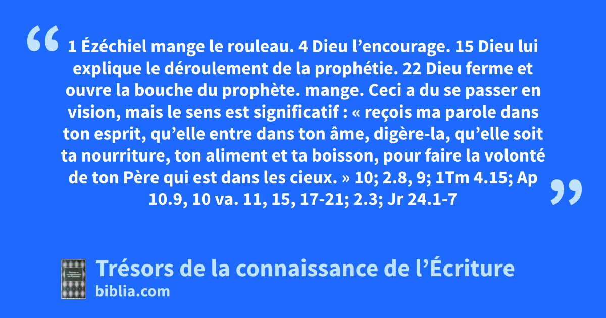 mange. Ceci a du se passer en vision, mais le sens est significatif : « reçois ma parole dans ton esprit, qu’elle entre dans ton âme, digère-la, qu’elle soit ta nourriture, ton aliment et ta boisson, pour faire la volonté de ton Père qui est dans les cieux. » 10; 2.8, 9; 1Tm 4.15; Ap 10.9, 10 va. 11, 15, 17-21; 2.3; Jr 24.1-7