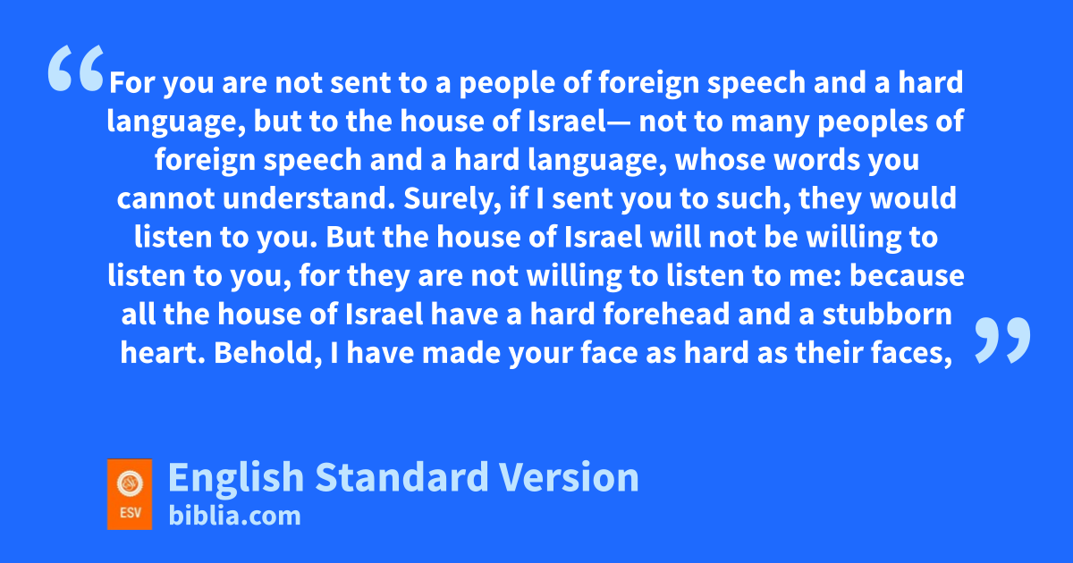 4 And he said to me, w“Son of man, go to the house of Israel and speak with my words to them. 5 For you are not sent to a people of foreign speech and a hard language, but to the house of Israel— 6 not to many peoples of foreign speech and a hard language, whose words you cannot understand. xSurely, if I sent you to such, they would listen to you. 7 yBut the house of Israel will not be willing to listen to you, for they are not willing to listen to me: because all the house of Israel zhave a hard forehead and a stubborn heart. 8 aBehold, I have made your face as hard as their faces, and your forehead as hard as their foreheads. 9 Like bemery harder than flint have I made your forehead. cFear them not, nor be dismayed at their looks, for they are a rebellious house.” 10 Moreover, he said to me, “Son of man, dall my words that I shall speak to you receive ein your heart, and hear with your ears. 11 And go to the exiles, fto your people, and speak to them and say to them, g‘Thus says the Lord God,’ hwhether they hear or refuse to hear.”
