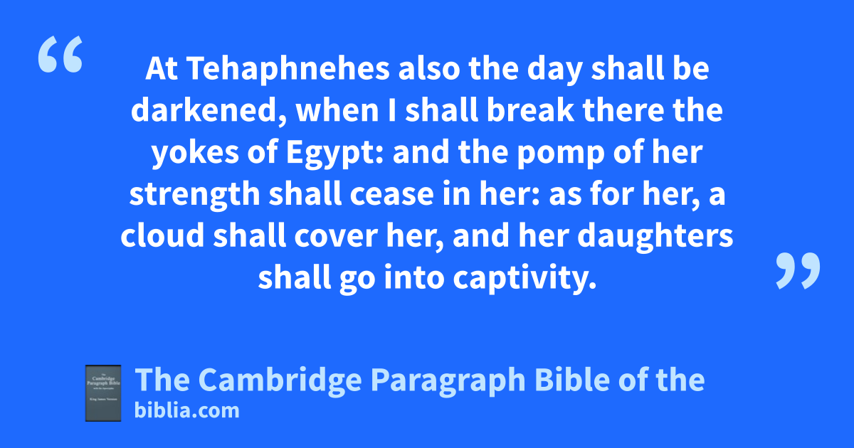 XXX. The word of the Lord came again unto me, saying, 2 Son of man, prophesy and say, Thus saith the Lord God; aHowl ye, Woe worth the day! 3 For bthe day is near, even abdthe day of the Lord is near, ca cloudy day; dit shall be the time of the heathen. 4 And ethe sword shall come upon Egypt, and fgreat * pain shall be in gEthiopia, when the slain shall fall in Egypt, and hthey shall take away her multitude, and iher foundations shall be broken down. 5 gkEthiopia, and * klLibya, and klLydia, and all mthe mingled people, and Chub, and the * men of the land that is in league, shall fall with them by the sword. 6 Thus saith the Lord; They also that uphold Egypt shall fall; and nthe pride of her power shall come down: * ofrom the tower of Syene shall they fall in it by the sword, saith the Lord God. 7 And they shall be pdesolate in the midst of the countries that are desolate, pand her cities shall be in the midst of the cities that are wasted. 8 qAnd they shall know that I am the Lord, rwhen I have set a fire in Egypt, and when all sher helpers shall be * destroyed. 9 In that day tshall messengers go forth from me in ships to make the careless gEthiopians afraid, and fgreat pain shall come upon them, as in the day of Egypt: for lo, eit cometh. 10 Thus saith the Lord God; uI will also make the multitude of Egypt to cease by the hand of Nebuchadrezzar king of Babylon. 11 He and his people with him, vthe terrible of the nations, shall be brought to destroy the land: and vthey shall draw their swords against Egypt, and fill the land with the slain. 12 And wI will make xthe rivers * ydry, and usell the land into the hand of zthe wicked: and xaI will make the land waste, and * all that is therein, by the hand of bstrangers: cI the Lord have spoken it. 13 Thus saith the Lord God; dI will also destroy the idols, and I will cause their eimages to cease out of fNoph; and gthere shall be no more a prince of the land of Egypt: and hI will put a fear in the land of Egypt. 14 And I will make iPathros desolate, and kwill set fire in * lZoan, and mwill execute judgments in nNo. 15 And I will pour my fury upon * Sin, the strength of Egypt; and I will cut off othe multitude of nNo. 16 And kI will set fire in Egypt: Sin shall have great pain, and nNo shall be rent asunder, and fNoph pshall have distresses daily. 17 The young men of * qAven and of * Phi-beseth shall fall by the sword: and these cities shall go into captivity. 18 At rTehaphnehes also the day shall be * darkened, swhen I shall break there the yokes of Egypt: and tthe pomp of her strength shall cease in her: as for her, a cloud shall cover her, and her daughters shall go into captivity. 19 Thus mwill I execute judgments in Egypt: uand they shall know that I am the Lord.