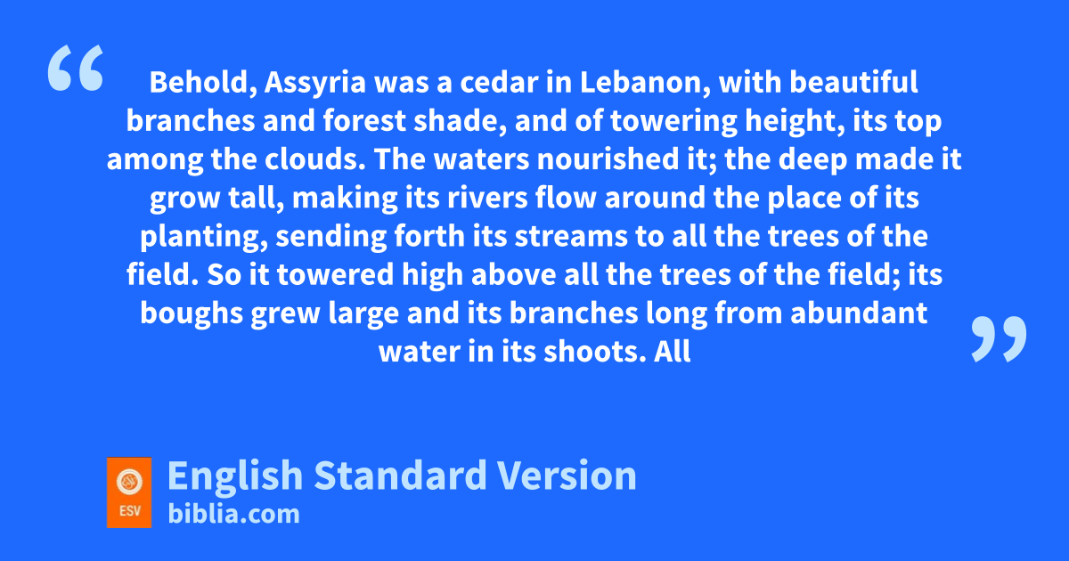 10 “Therefore thus says the Lord God: Because kit2 towered high and set its top among the clouds,3 and lits heart was proud of its height, 11 I will give it into the hand of a mighty one of the nations. He shall surely deal with it as its wickedness deserves. I have cast it out. 12 mForeigners, mthe most ruthless of nations, have cut it down and left it. nOn the mountains and in all the valleys its branches have fallen, and its boughs have been broken in all othe ravines of the land, and pall the peoples of the earth have gone away from its shadow and left it. 13 qOn its fallen trunk dwell all the birds of the heavens, and on its branches are all the beasts of the field. 14 rAll this is in order that no trees by the waters may grow to towering height or set their tops among the clouds,4 and that no trees that drink water may reach up to them in height. For they are all given over to death, sto the world tbelow, among the children of man,5 with those who go down to the pit.