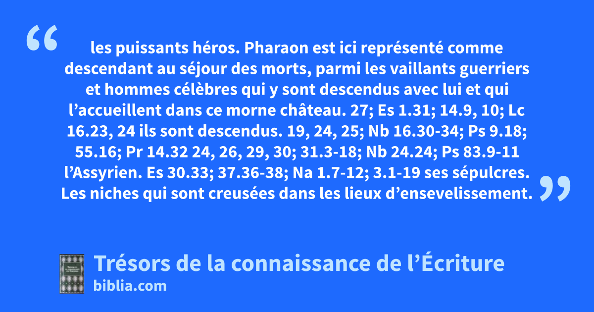 les puissants héros. Pharaon est ici représenté comme descendant au séjour des morts, parmi les vaillants guerriers et hommes célèbres qui y sont descendus avec lui et qui l’accueillent dans ce morne château. 27; Es 1.31; 14.9, 10; Lc 16.23, 24 ils sont descendus. 19, 24, 25; Nb 16.30-34; Ps 9.18; 55.16; Pr 14.32