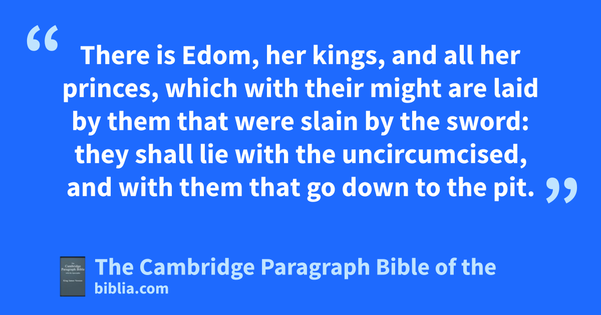 17 * It came to pass also in the twelfth year, din the fifteenth day of the month, that the word of the Lord came unto me, saying, 18 Son of man, wail for cthe multitude of Egypt, and ecast them down, even her, and bbthe daughters of the famous nations, efunto the nether parts of the earth, efwith them that go down into the pit. 19 gWhom dost thou pass in beauty? hgo down, and ibe thou laid with jthe uncircumcised. 20 They shall fall in the midst of kthem that are slain by the sword: * she is delivered to the sword: draw her and all cher multitudes. 21 lThe strong among the mighty mshall speak to him out of the midst of hell with nthem that help him: hrthey are gone down, they lie juncircumcised, kslain by the sword. 22 oAsshur is there and all her company: oohis graves are about him: all of them kslain, fallen by the sword: 23 whose graves are set in pthe sides of the pit, and her company is round about her grave: all of them kslain, fallen by the sword, qwhich caused * terror rin the land of the living. 24 oThere is sElam and all cher multitude round about her grave, all of them kslain, fallen by the sword, hwhich are gone down juncircumcised finto the nether parts of the earth, qwhich caused their terror rin the land of the living; yet thave they borne their shame fwith them that go down to the pit. 25 They have set her ua bed in the midst of the slain with all cher multitude: ooher graves are round about him: all of them juncircumcised, kslain by the sword: though qtheir terror was caused rin the land of the living, yet thave they borne their shame fwith them that go down to the pit: he is put in the midst of them that be slain. 26 oThere is vMeshech, vTubal, and all cher multitude: ooher graves are round about him: all of them juncircumcised, kslain by the sword, though qthey caused their terror rin the land of the living. 27 And wthey shall not lie with xthe mighty that are fallen of jthe uncircumcised, ywhich are gone down to hell * with their weapons of war: and ythey have laid their swords under their heads, but their iniquities shall be upon their bones, though they were qthe terror of xthe mighty rin the land of the living. 28 Yea, thou shalt be broken in the midst of jthe uncircumcised, and iwshalt lie with kthem that are slain with the sword. 29 oThere is zEdom, her kings, and all her princes, which with their might are * laid by kthem that were slain by the sword: ithey shall lie with jthe uncircumcised, and fwith them that go down to the pit. 30 oThere be athe princes of bthe north, all of them, and all cthe Zidonians, which are gone down with the slain; with their terror they are ashamed of their might; and ithey lie juncircumcised kwith them that be slain by the sword, and tbear their shame fwith them that go down to the pit. 31 Pharaoh shall see them, and dshall be comforted over all ehis multitude, even Pharaoh and all his army kslain by the sword, saith the Lord God. 32 For qI have caused my terror rin the land of the living: and ihe shall be laid in the midst of jthe uncircumcised with kthem that are slain with the sword, even Pharaoh and all ehis multitude, saith the Lord God.