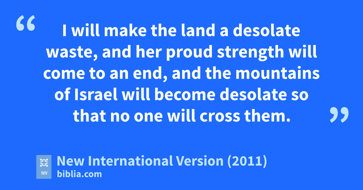 27 “Say this to them: ‘This is what the Sovereign Lord says: As surely as I live, those who are left in the ruins will fall by the sword, those out in the country I will give to the wild animals to be devoured, and those in strongholds and caves will die of a plague.h 28 I will make the land a desolate waste, and her proud strength will come to an end, and the mountainsi of Israel will become desolate so that no one will cross them.j 29 Then they will know that I am the Lord, when I have made the land a desolatek waste because of all the detestable things they have done.’l
