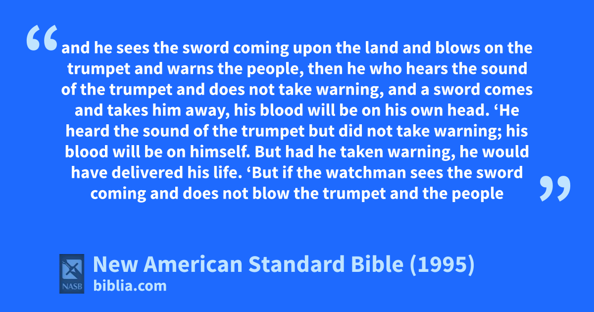 3 and he sees the sword coming upon the land and ablows on the trumpet and warns the people,