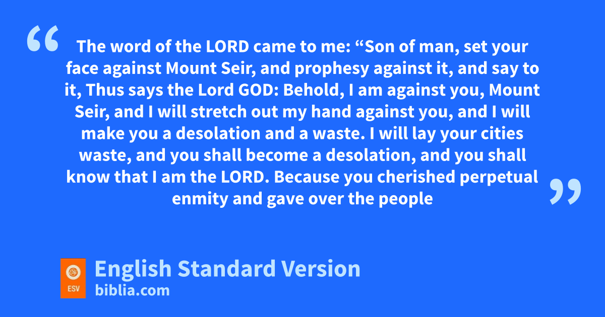 35 The word of the Lord came to me: 2 f“Son of man, gset your face hagainst iMount Seir, and prophesy against it, 3 and say to it, Thus says the Lord God: jBehold, I am against you, Mount Seir, and kI will stretch out my hand against you, land I will make you a desolation and a waste. 4 mI will lay your cities waste, and you shall become a desolation, and you shall know that I am the Lord. 5 Because nyou cherished perpetual enmity and gave over the people of Israel to the power of the sword oat the time of their calamity, pat the time of their final punishment, 6 therefore, qas I live, declares the Lord God, I will prepare you for blood, and blood shall pursue you; rbecause you did not hate bloodshed, therefore blood shall pursue you. 7 lI will make Mount Seir a waste mand a desolation, and I will cut off from it sall who come and go. 8 And I will fill tits mountains with the slain. On your hills and in your valleys and in all tyour ravines uthose slain with the sword shall fall. 9 lI will make you a perpetual desolation, and myour cities shall not be inhabited. Then vyou will know that I am the Lord.