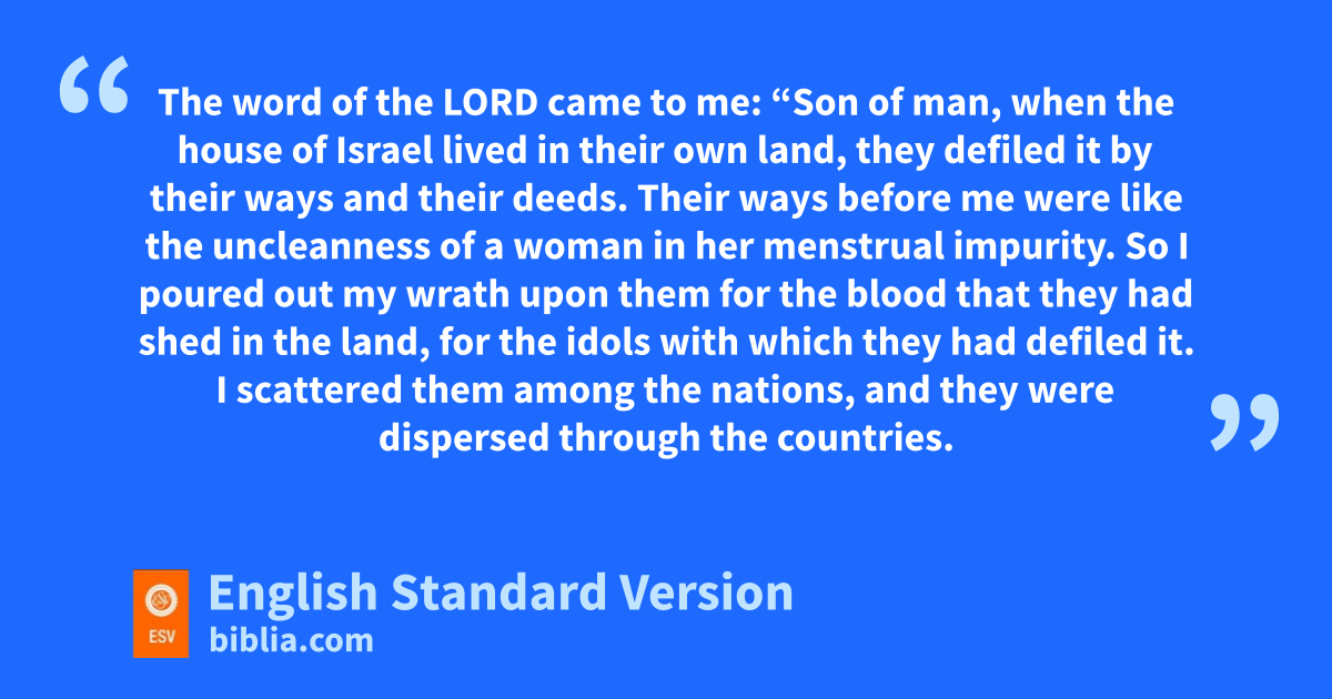 16 The word of the Lord came to me: 17 o“Son of man, when the house of Israel lived in their own land, pthey defiled it by their ways and their deeds. Their ways before me were qlike the uncleanness of a woman in her menstrual impurity. 18 So rI poured out my wrath upon them sfor the blood that they had shed in the land, for the idols twith which they had defiled it. 19 uI scattered them among the nations, and they were dispersed through the countries. vIn accordance with their ways and their deeds I judged them. 20 But when they came to the nations, wherever they came, wthey profaned my holy name, in that people said of them, ‘These are the people of the Lord, and yet they had to go out of his land.’ 21 But I had concern xfor my holy name, which the house of Israel had profaned among the nations to which they came.