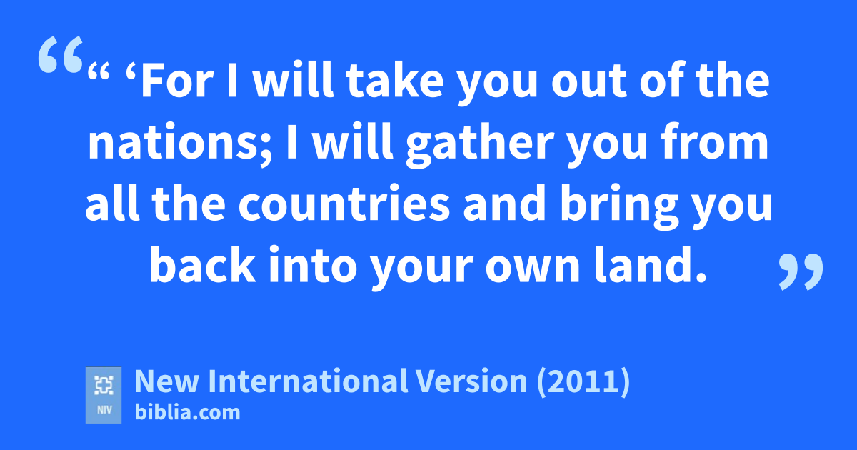 24 “ ‘For I will take you out of the nations; I will gather you from all the countries and bring you back into your own land.v 25 I will sprinklew clean water on you, and you will be clean; I will cleansex you from all your impuritiesy and from all your idols.z 26 I will give you a new hearta and put a new spirit in you; I will remove from you your heart of stoneb and give you a heart of flesh.c 27 And I will put my Spiritd in you and move you to follow my decreese and be careful to keep my laws.f 28 Then you will live in the land I gave your ancestors; you will be my people,g and I will be your God.h 29 I will save you from all your uncleanness. I will call for the grain and make it plentiful and will not bring faminei upon you. 30 I will increase the fruit of the trees and the crops of the field, so that you will no longer suffer disgrace among the nations because of famine.j 31 Then you will remember your evil ways and wicked deeds, and you will loathe yourselves for your sins and detestable practices.k 32 I want you to know that I am not doing this for your sake, declares the Sovereign Lord. Be ashamedl and disgraced for your conduct, people of Israel!m