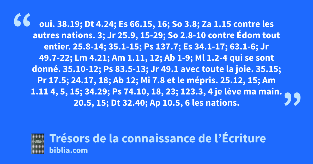 oui. 38.19; Dt 4.24; Es 66.15, 16; So 3.8; Za 1.15 contre les autres nations. 3; Jr 25.9, 15-29; So 2.8-10 contre Édom tout entier. 25.8-14; 35.1-15; Ps 137.7; Es 34.1-17; 63.1-6; Jr 49.7-22; Lm 4.21; Am 1.11, 12; Ab 1-9; Ml 1.2-4 qui se sont donné. 35.10-12; Ps 83.5-13; Jr 49.1 avec toute la joie. 35.15; Pr 17.5; 24.17, 18; Ab 12; Mi 7.8 et le mépris. 25.12, 15; Am 1.11