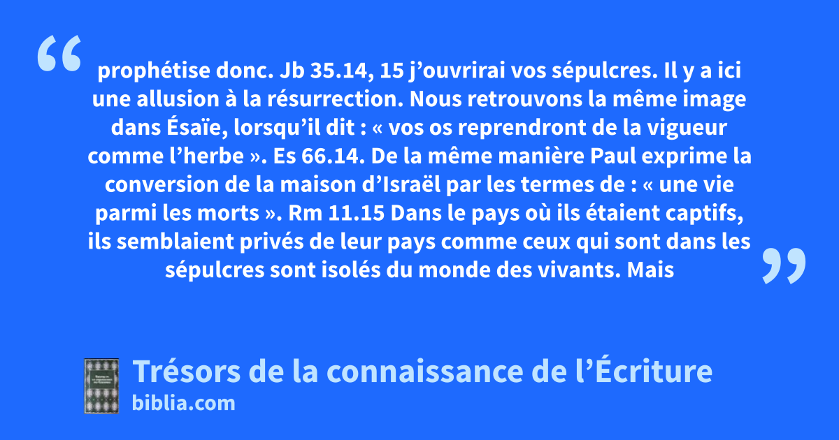 prophétise donc. Jb 35.14, 15 j’ouvrirai vos sépulcres. Il y a ici une allusion à la résurrection. Nous retrouvons la même image dans Ésaïe, lorsqu’il dit : « vos os reprendront de la vigueur comme l’herbe ». Es 66.14. De la même manière Paul exprime la conversion de la maison d’Israël par les termes de : « une vie parmi les morts ». Rm 11.15 Dans le pays où ils étaient captifs, ils semblaient privés de leur pays comme ceux qui sont dans les sépulcres sont isolés du monde des vivants. Mais lorsque Cyrus a proclamé leur liberté, l’Éternel a ouvert leurs tombeaux, a remis Son Esprit en eux, pour qu’ils puissent vivre, et qu’ils soient rétablis sur leurs propres terres. 21; Es 26.19; 66.14; Os 6.2; 13.14; 1Th 4.16; Ap 20.13 et je vous ramènerai. 25; 28.25; 36.24; Esd 1.1-2.70; Am 9.14, 15