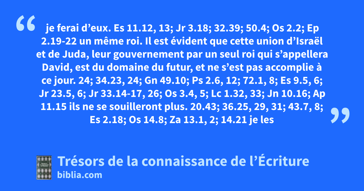 je ferai d’eux. Es 11.12, 13; Jr 3.18; 32.39; 50.4; Os 2.2; Ep 2.19-22 un même roi. Il est évident que cette union d’Israël et de Juda, leur gouvernement par un seul roi qui s’appellera David, est du domaine du futur, et ne s’est pas accomplie à ce jour. 24; 34.23, 24; Gn 49.10; Ps 2.6, 12; 72.1, 8; Es 9.5, 6; Jr 23.5, 6; Jr 33.14-17, 26; Os 3.4, 5; Lc 1.32, 33; Jn 10.16; Ap 11.15