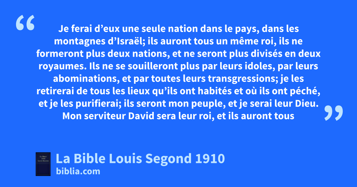 15La parole de l’Éternel me fut adressée, en ces mots: 16Et toi, fils de l’homme, prends une pièce de bois, et écris dessus: Pour Juda et pour les enfants d’Israël qui lui sont associés. Prends une autre pièce de bois, et écris dessus: Pour Joseph, bois d’Éphraïm et de toute la maison d’Israël qui lui est associée. 17Rapproche-les l’une et l’autre pour en former une seule pièce, en sorte qu’elles soient unies dans ta main. 18Et lorsque les enfants de ton peuple te diront: Ne nous expliqueras-tu pas ce que cela signifie? 19réponds-leur: Ainsi parle le Seigneur, l’Éternel: Voici, je prendrai le bois de Joseph qui est dans la main d’Éphraïm, et les tribus d’Israël qui lui sont associées; je les joindrai au bois de Juda, et j’en formerai un seul bois, en sorte qu’ils ne soient qu’un dans ma main. 20Les bois sur lesquels tu écriras seront dans ta main, sous leurs yeux. 21Et tu leur diras: Ainsi parle le Seigneur, l’Éternel: Voici, je prendrai les enfants d’Israël du milieu des nations où ils sont allés, je les rassemblerai de toutes parts, et je les ramènerai dans leur pays. 22Je ferai d’eux une seule nation dans le pays, dans les montagnes d’Israël; ils auront tous aun même roi, ils ne formeront plus deux nations, et ne seront plus divisés en deux royaumes. 23Ils ne se souilleront plus par leurs idoles, par leurs abominations, et par toutes leurs transgressions; je les retirerai de tous les lieux qu’ils ont habités et où ils ont péché, et je les purifierai; ils seront mon peuple, et je serai leur Dieu. 24bMon serviteur David sera leur roi, et ils auront tous un seul pasteur. Ils suivront mes ordonnances, ils observeront mes lois et les mettront en pratique. 25Ils habiteront le pays que j’ai donné à mon serviteur Jacob, et qu’ont habité vos pères; ils y habiteront, eux, leurs enfants, et les enfants de leurs enfants, à perpétuité; et mon serviteur David sera leur prince pour toujours. 26Je traiterai avec eux une calliance de paix, et il y aura une alliance éternelle avec eux; je les établirai, je les multiplierai, et je placerai mon dsanctuaire au milieu d’eux pour toujours. 27Ma demeure sera parmi eux; je serai leur eDieu, et ils seront mon peuple. 28Et les nations sauront que je suis l’Éternel, qui sanctifie Israël, lorsque mon sanctuaire sera pour toujours au milieu d’eux.
