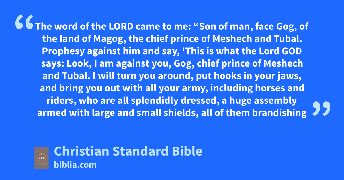38 The word of the Lord came to me: 2 “Son of man, face Gog, of the land of Magog,ak the chief prince ofB Meshech and Tubal.al Prophesy against him 3 and say, ‘This is what the Lord God says: Look, I am against you, Gog, chief prince of Meshech and Tubal. 4 I will turn you around, put hooks in your jaws,a and bring you out with all your army, including horses and riders,b who are all splendidly dressed, a huge assembly armed with large and small shields, all of them brandishing swords. 5 Persia,c Cush, and Put are with them, all of them with shields and helmets; 6 Gomerd with all its troops; and Beth-togarmahe from the remotest parts of the north along with all its troops—many peoples are with you.