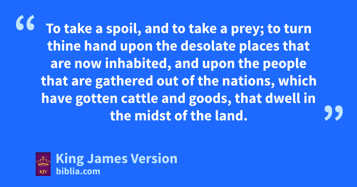 10 Thus saith the Lord God; It shall also come to pass, that at the same time shall things fcome into thy mind, and thou shalt ||think an evil thought: 11 And thou shalt say, I will go up to the land of gunwalled villages; I will go to them that are at rest, ahthat dwell ||safely, all of them dwelling without walls, and hhaving neither bars nor gates, 12 †iTo take a spoil, and to take a prey; to turn thine hand upon jthe desolate places that are now inhabited, and upon the people that are kgathered out of the nations, which have gotten lcattle and goods, that dwell in the †midst of the land. 13 mSheba, and nDedan, and othe merchants of Tarshish, with all pthe young lions thereof, shall say unto thee, Art thou come ito take a spoil? hast thou gathered thy company ito take a prey? to carry away silver and gold, to take away lcattle and goods, ito take a great spoil? 14 Therefore, son of man, prophesy and say unto Gog, Thus saith the Lord God; qIn that day when my people of Israel adwelleth safely, rshalt thou not know it? 15 And sthou shalt come from thy place out of the north parts, thou, and tmany people with thee, all of them uriding upon horses, a great company, and a mighty army: 16 And thou shalt come up against my people of Israel, das a cloud to cover the land; it shall be vin the latter days, and I will bring thee against my land, that the heathen may know me, wwhen I shall be sanctified in thee, O Gog, xbefore their eyes.
