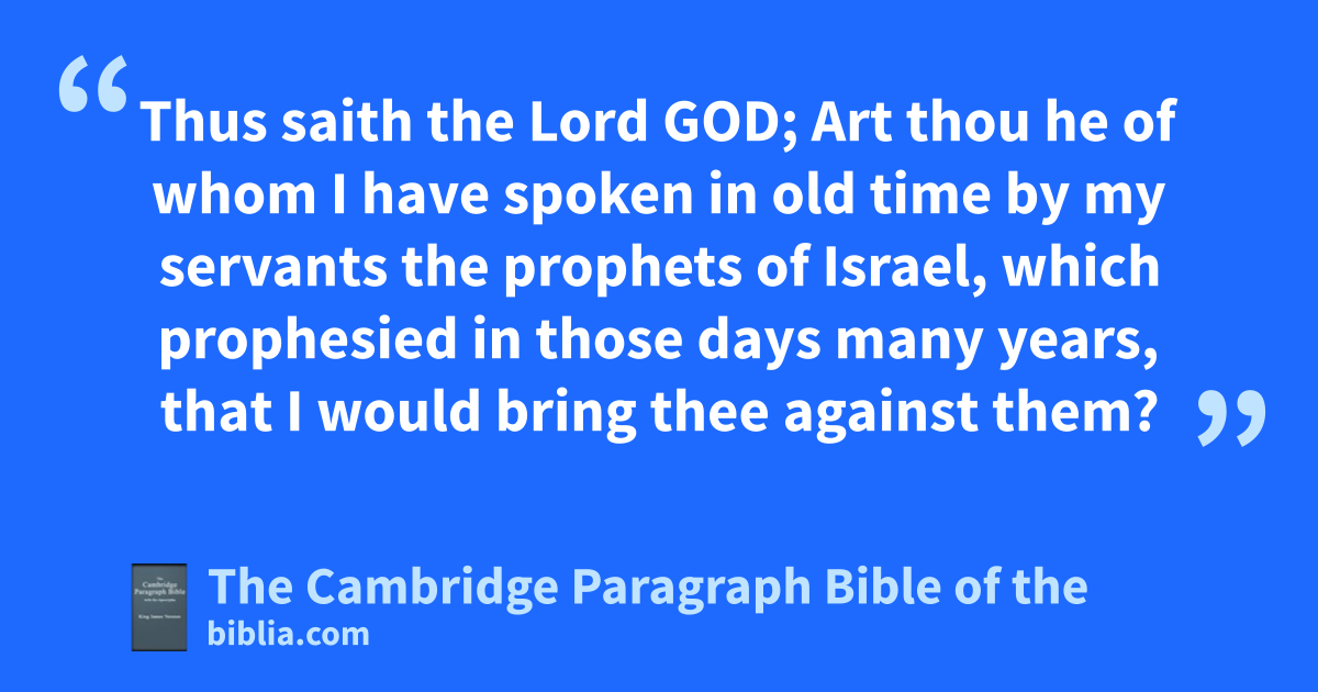 XXXVIII. And the word of the Lord came unto me, saying, 2 aSon of man, bset thy face against acGog, the land of cdMagog, * athe chief prince of eMeshech and eTubal, aand prophesy against him, 3 and say, Thus saith the Lord God; aBehold, fI am against thee, O cGog, athe chief prince of eMeshech and eTubal: 4 gand I will turn thee back, and hput hooks into thy jaws, and I will bring thee forth, and iall thine army, horses and ihorsemen, all of them kclothed with all sorts of armour, even a great company with lbucklers and lshields, all of them handling swords: 5 mPersia, nEthiopia, and * mLibya with them; all of them with mshield and mhelmet: 6 oGomer, and all his pbands; the house of qTogarmah rof sthe north quarters, and all his pbands: and rmany people with thee. 7 tBe thou prepared, and uprepare for thyself, thou, and all thy company that are assembled unto thee, and be thou a guard unto them. 8 vAfter many days wthou shalt be visited: vin the latter years thou shalt come into the land that is brought back from the sword, and is xgathered out of many people, against ythe mountains of Israel, which zhave been always waste: but it is brought forth out of the nations, and they shall adwell safely all of them. 9 Thou shalt ascend and come blike a cstorm, thou shalt be dlike a cloud to cover the land, thou, and all ethy bands, eand many people with thee.