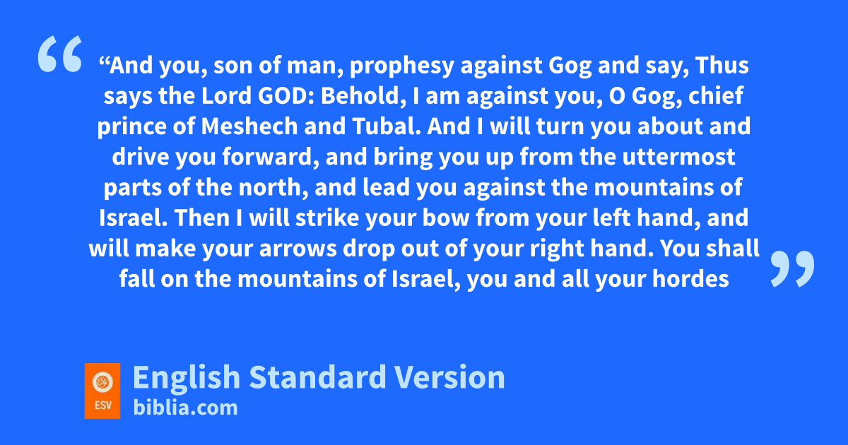 39 “And you, qson of man, rprophesy against sGog and say, Thus says the Lord God: Behold, tI am against you, O Gog, uchief prince of vMeshech1 and vTubal. 2 wAnd I will turn you about and drive you forward,2 and bring you up from xthe uttermost parts of the north, and lead you against the ymountains of Israel. 3 Then zI will strike your bow from your left hand, and zwill make your arrows drop out of your right hand. 4 aYou shall fall on ythe mountains of Israel, you and all your bhordes and the peoples who are with you. cI will give you to birds of prey of every sort and to the beasts of the field to be devoured. 5 You shall fall in the open field, for dI have spoken, declares the Lord God. 6 eI will send fire on fMagog and on those gwho dwell securely in hthe coastlands, and ithey shall know that I am the Lord.