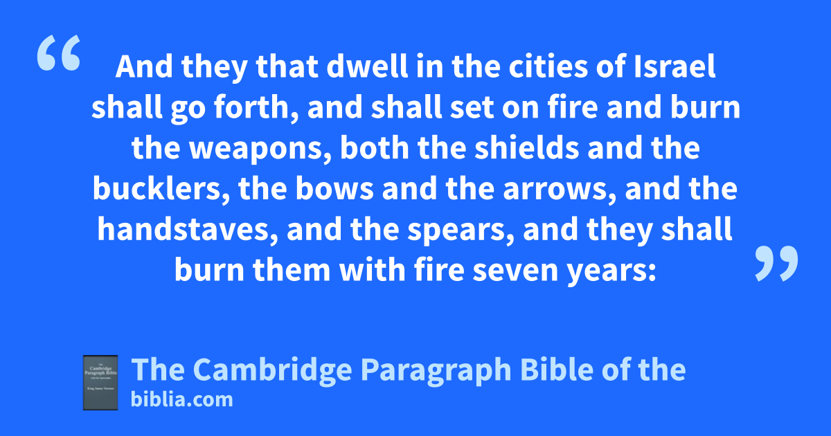 8 vBehold, it is come, and vwit is done, saith the Lord God; this is the day xwhereof I have spoken. 9 And they that dwell in the cities of Israel shall go forth, and xxshall set on fire and yburn zthe weapons, both zzthe shields and the bucklers, the bows and the arrows, and the * handstaves, and the spears, and they shall * burn them with fire seven years: 10 so that they shall take no wood out of the field, neither cut down any out of the forests; for they shall burn zthe weapons with fire: and athey shall spoil those that spoiled them, and rob those that robbed them, saith the Lord God. 11 And it shall come to pass in bthat day, that I will give unto Gog a place there of graves in Israel, the valley of the passengers on the east of the sea: and it shall stop the * noses of the passengers: and there shall they bury Gog and all his multitude: and they shall call it The valley of * Hamon-gog. 12 And seven months shall the house of Israel be burying of them, cthat they may cleanse the land. 13 Yea, all the people of the land shall bury them; and it shall be to them da renown the day that eI shall be glorified, saith the Lord God. 14 And they shall sever out * men of continual employment, passing through the land to bury fwith the passengers those that remain upon the face of the earth, cto cleanse it: after the end of gseven months shall they search. 15 And fthe passengers that pass through the land, when any seeth a man’s bone, then shall he * set up ha sign by it, till the buriers have buried it in ithe valley of Hamon-gog. 16 And also the name of the city shall be * Hamonah. cThus shall they cleanse the land.