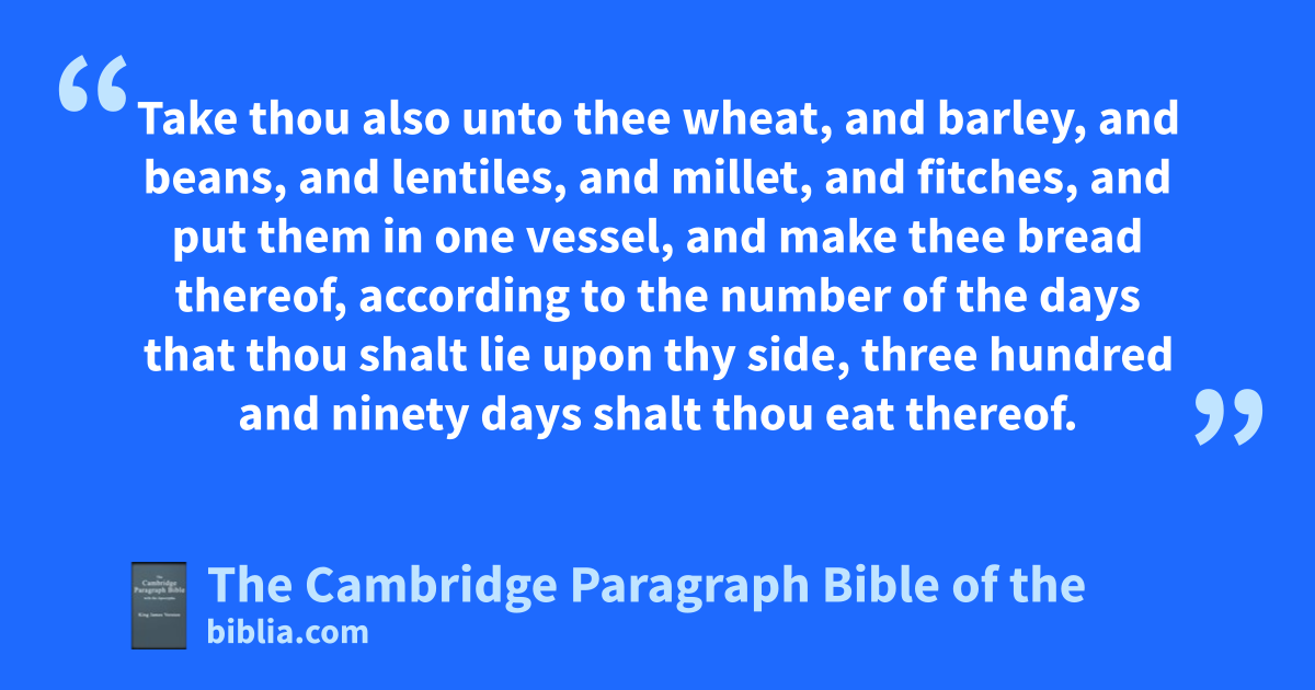 9 Take thou also unto thee wheat, and barley, and rbeans, and rslentiles, and millet, and * tfitches, and put them in one vessel, and make thee bread thereof, uaccording to the number of the days that thou shalt lie upon thy side, qthree hundred and ninety days shalt thou eat thereof. 10 And tvthy meat which thou shalt eat shall be vby weight, twenty wshekels a day: from time to time shalt thou eat it. 11 xThou shalt drink also water xyby measure, the sixth part of yya hin: from time to time shalt thou drink. 12 And thou shalt eat it as barley cakes, and thou shalt bake it with dung that cometh out of man, zin their sight. 13 And the Lord said, Even thus zzshall the children of Israel eat their defiled bread among the Gentiles, whither I will drive them. 14 Then said I, aAh Lord God, behold, my soul hath not been polluted: bfor from my youth up even till now have I not eaten of cdthat which dieth of itself, or ceis torn in pieces; neither came there fabominable flesh into my mouth. 15 Then he said unto me, Lo, I have given thee cow’s dung gfor man’s dung, and thou shalt prepare thy bread therewith. 16 Moreover he said unto me, Son of man, behold, hI will break the staff of bread in Jerusalem: and vthey shall eat bread by weight, and iwith care; and xthey shall drink water by measure, and iwith astonishment: 17 that they may want bread and water, and be astonied one with another, and kconsume away for their iniquity.