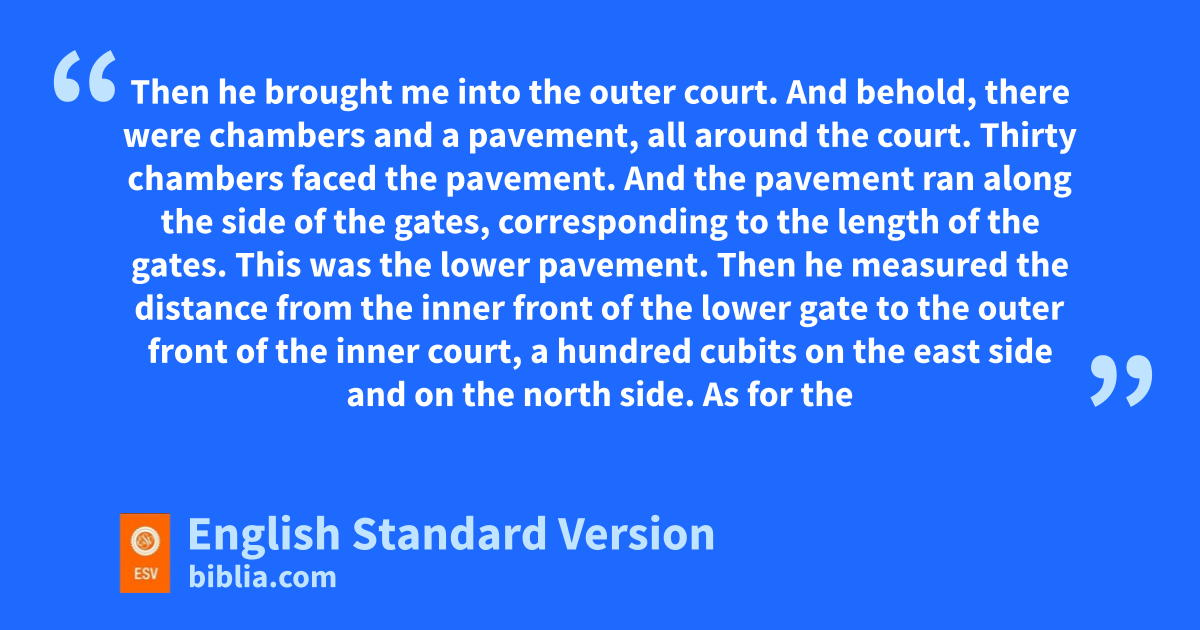 17 Then he brought me into uthe outer court. And behold, there were vchambers and a wpavement, all around the court. xThirty chambers faced the pavement. 18 And the pavement ran along the side of the gates, corresponding to the length of the gates. This was the lower pavement. 19 Then he measured the distance from the inner front of the lower gate to the outer front of the inner court,5 a hundred cubits on the east side and on the north side.6