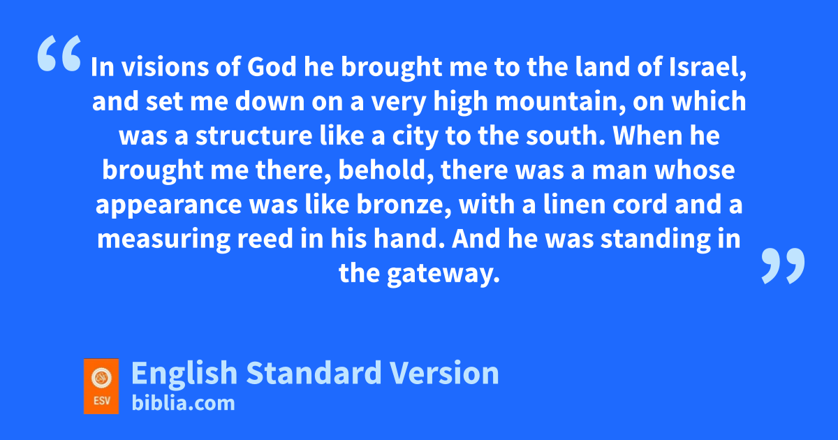 40 wIn the twenty-fifth year xof our exile, at the beginning of the year, on the tenth day of the month, yin the fourteenth year after the city was struck down, on that very day, zthe hand of the Lord was upon me, and he brought me to the city.1 2 In avisions of God he brought me to the land of Israel, and set me down on ba very high mountain, on which was a structure like a city to the south. 3 When he brought me there, behold, there was ca man whose appearance was dlike bronze, with ea linen cord and fa measuring reed in his hand. And he was standing in the gateway. 4 And the man said to me, g“Son of man, hlook with your eyes, and hhear with your ears, and set your heart upon all that I shall show you, for you were brought here in order that I might show it to you. iDeclare all that you see to the house of Israel.”