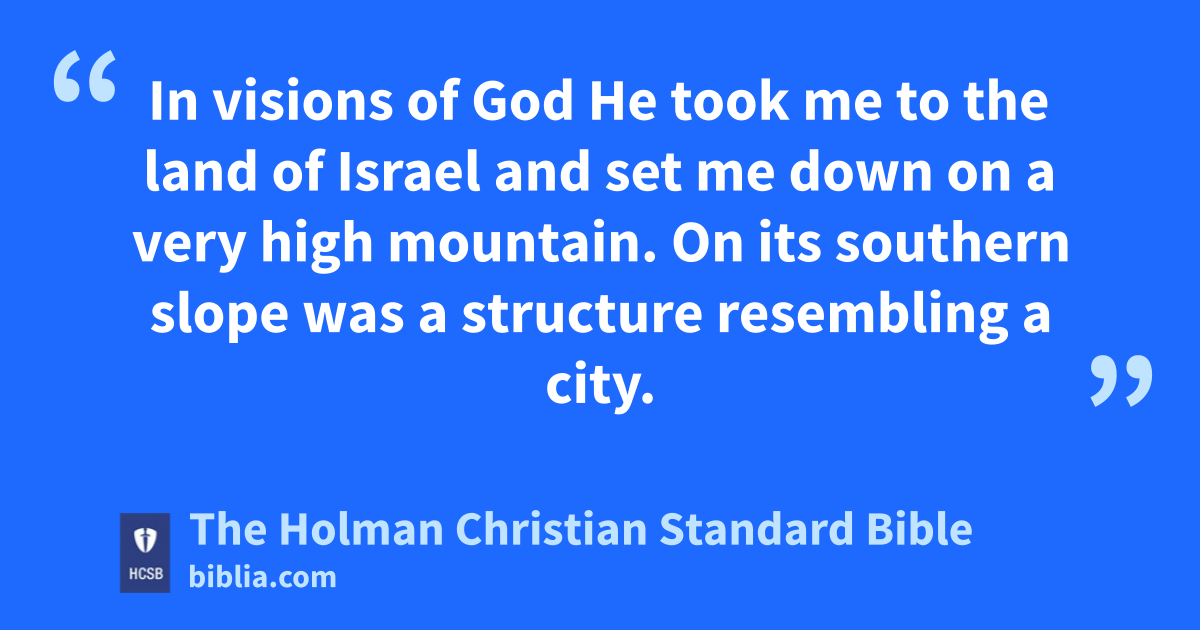 40 In the twenty-fifth year of our exile, at the beginning of the year, on the tenth day of the month in the fourteenth year after Jerusalem had been captured, c on that very day the Lord’s hand was on me, d and He brought me there. 2 In visions of God e He took me to the land of Israel and set me down on a very high mountain. f On its southern slope was a structure resembling a city. 3 He brought me there, and I saw a man whose appearance was like bronze, g with a linen cord and a measuring rod in his hand. h He was standing by the gate. 4 He spoke to me: “Son of man, look with your eyes, listen with your ears, i and pay attention to everything I am going to show you, for you have been brought here so that I might show it to you. Report everything you see to the house of Israel.” j