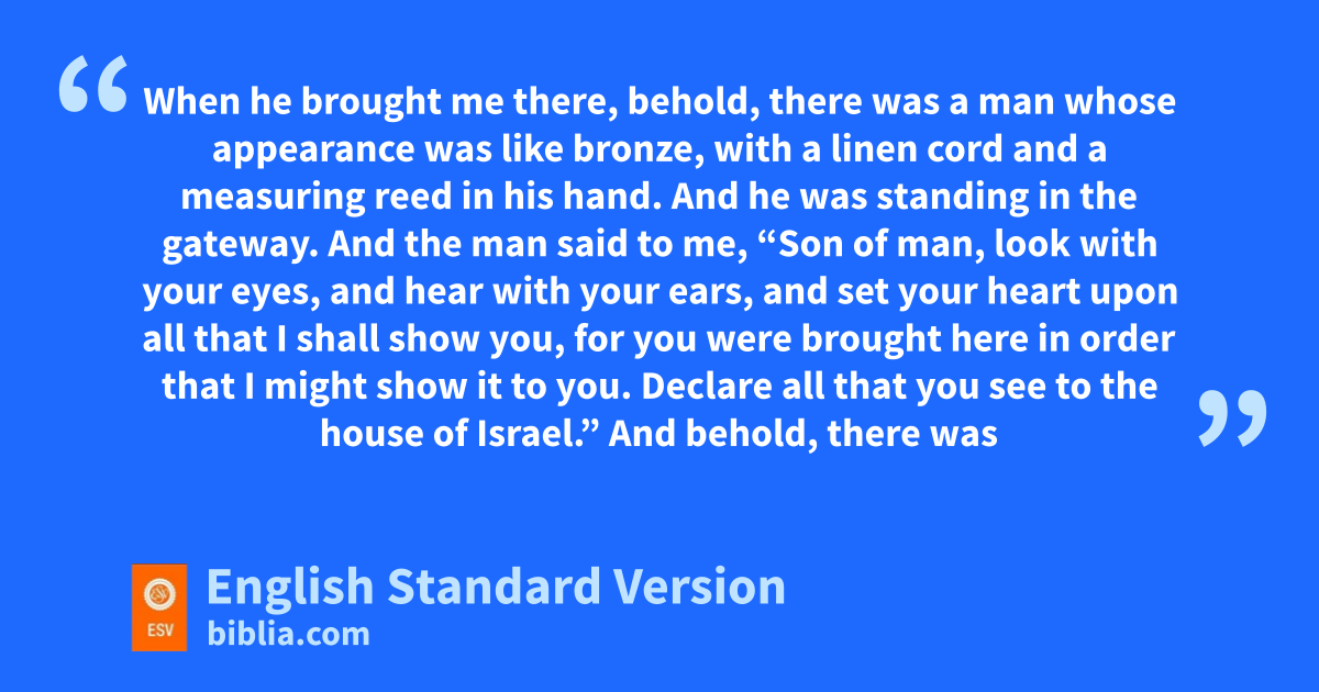 40 wIn the twenty-fifth year xof our exile, at the beginning of the year, on the tenth day of the month, yin the fourteenth year after the city was struck down, on that very day, zthe hand of the Lord was upon me, and he brought me to the city.1 2 In avisions of God he brought me to the land of Israel, and set me down on ba very high mountain, on which was a structure like a city to the south. 3 When he brought me there, behold, there was ca man whose appearance was dlike bronze, with ea linen cord and fa measuring reed in his hand. And he was standing in the gateway. 4 And the man said to me, g“Son of man, hlook with your eyes, and hhear with your ears, and set your heart upon all that I shall show you, for you were brought here in order that I might show it to you. iDeclare all that you see to the house of Israel.”