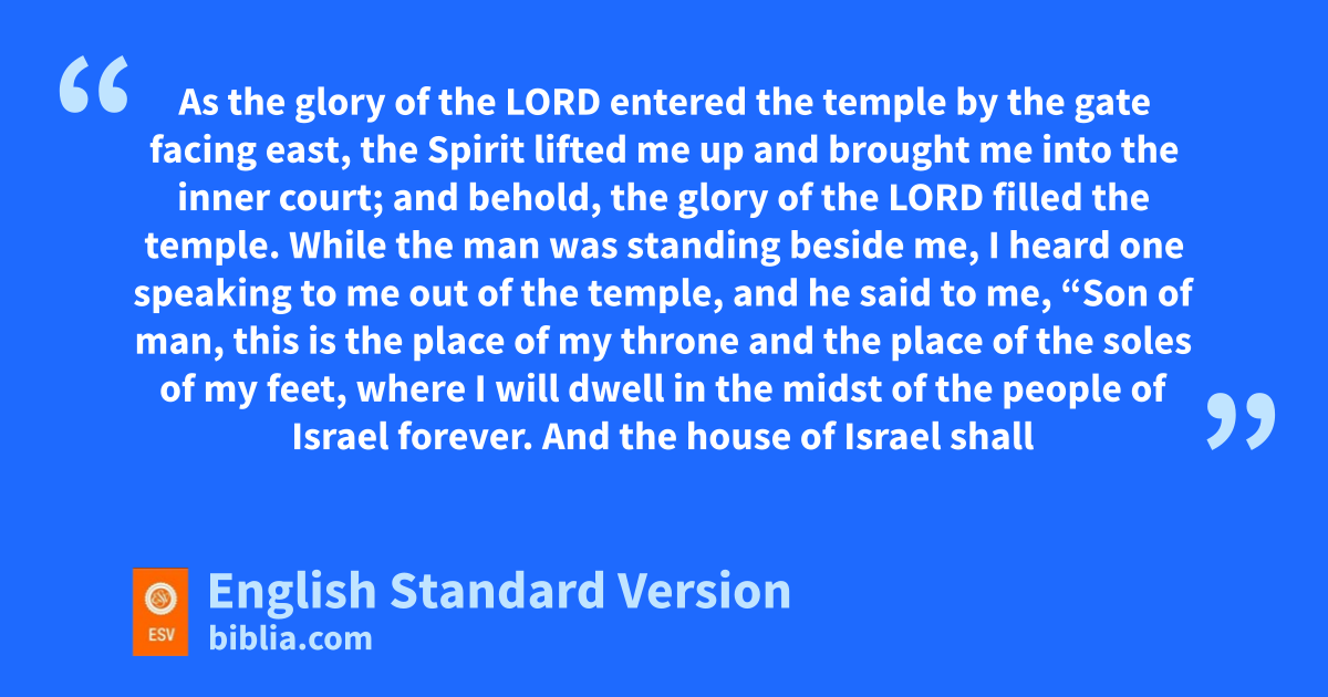 43 Then he led me to bthe gate, the gate facing east. 2 And behold, cthe glory of the God of Israel was coming from the east. And dthe sound of his coming was like the sound of many waters, and ethe earth shone with his glory. 3 And fthe vision I saw was just like the vision that I had seen gwhen he1 came to destroy the city, and just like hthe vision that I had seen iby the Chebar canal. And jI fell on my face. 4 As cthe glory of the Lord kentered the temple by the gate facing east, 5 lthe Spirit lifted me up and brought me into mthe inner court; and behold, nthe glory of the Lord filled the temple.
