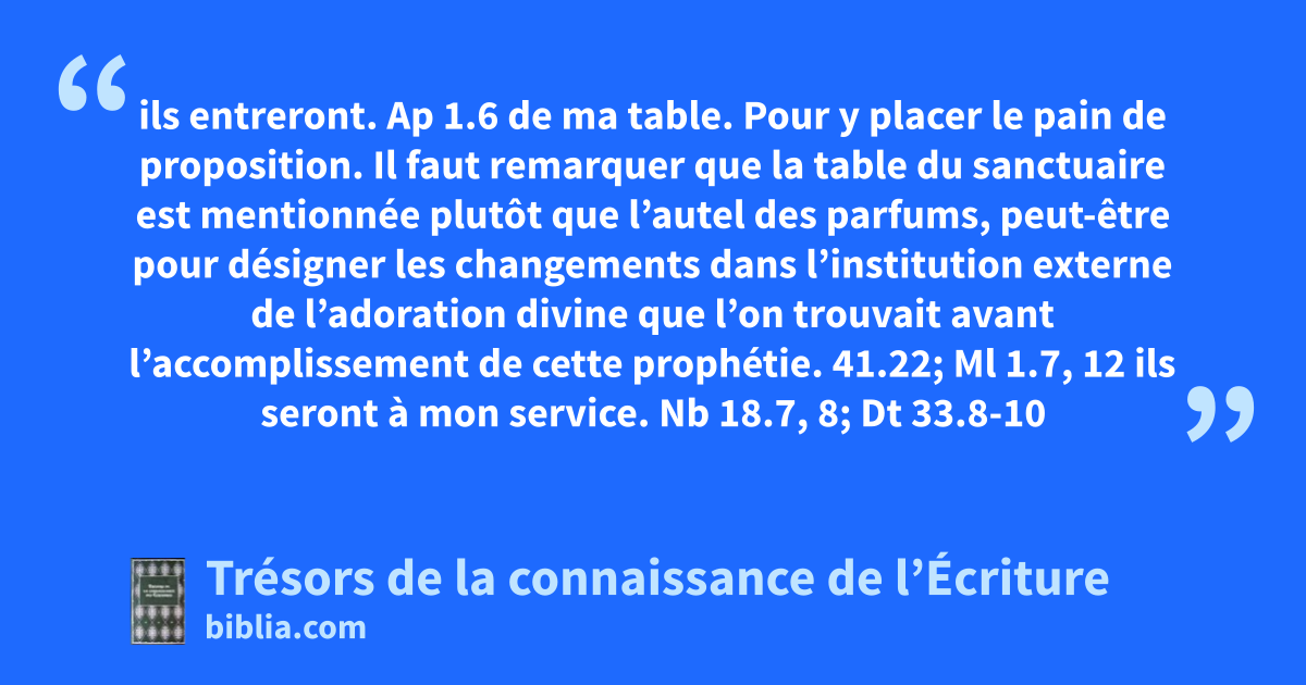 ils entreront. Ap 1.6 de ma table. Pour y placer le pain de proposition. Il faut remarquer que la table du sanctuaire est mentionnée plutôt que l’autel des parfums, peut-être pour désigner les changements dans l’institution externe de l’adoration divine que l’on trouvait avant l’accomplissement de cette prophétie. 41.22; Ml 1.7, 12 ils seront à mon service. Nb 18.7, 8; Dt 33.8-10