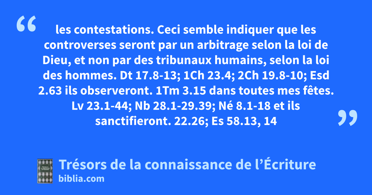 les contestations. Ceci semble indiquer que les controverses seront par un arbitrage selon la loi de Dieu, et non par des tribunaux humains, selon la loi des hommes. Dt 17.8-13; 1Ch 23.4; 2Ch 19.8-10; Esd 2.63 ils observeront. 1Tm 3.15 dans toutes mes fêtes. Lv 23.1-44; Nb 28.1-29.39; Né 8.1-18 et ils sanctifieront. 22.26; Es 58.13, 14