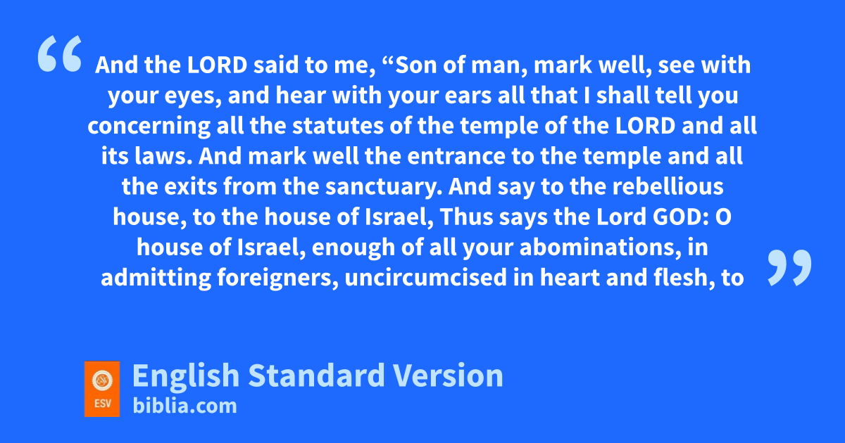 4 Then he brought me by way of cthe north gate to the front of the temple, and I looked, and behold, dthe glory of the Lord filled the temple of the Lord. And eI fell on my face. 5 And the Lord said to me, f“Son of man, mark well, gsee with your eyes, gand hear with your ears all that I shall tell you concerning hall the statutes of the temple of the Lord and all its laws. And mark well hthe entrance to the temple and all the exits from the sanctuary. 6 And say to ithe rebellious house,1 to the jhouse of Israel, Thus says the Lord God: O house of Israel, kenough of all your abominations, 7 in ladmitting foreigners, muncircumcised in heart and flesh, to be in my sanctuary, nprofaning my temple, when you offer to me my food, the fat and the blood. You2 have broken my covenant, in addition to all your abominations. 8 And oyou have not kept charge of my holy things, but you have set others to keep my charge for you in my sanctuary.