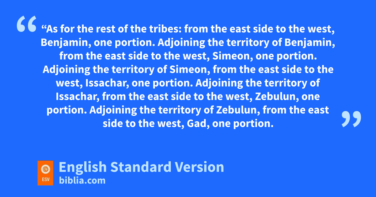 23 “As for the rest of the tribes: from the east side to the west, Benjamin, one portion. 24 Adjoining the territory of Benjamin, from the east side to the west, Simeon, one portion. 25 Adjoining the territory of Simeon, from the east side to the west, Issachar, one portion. 26 Adjoining the territory of Issachar, from the east side to the west, Zebulun, one portion. 27 Adjoining the territory of Zebulun, from the east side to the west, Gad, one portion. 28 And adjoining the territory of Gad to the south, the boundary shall run gfrom Tamar to the waters of gMeribah-kadesh, from there along the Brook of Egypt6 to hthe Great Sea.7 29 This is the land that iyou shall allot as an inheritance among the tribes of Israel, and these are their portions, declares the Lord God.