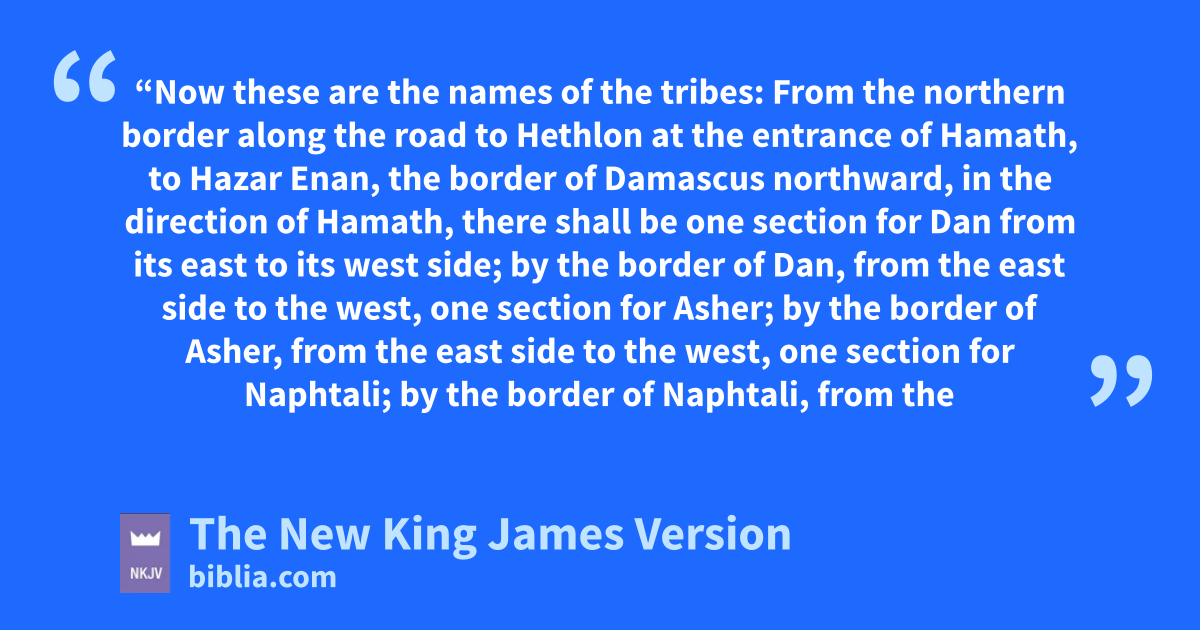 48 “Now these are the names of the tribes: aFrom the northern border along the road to Hethlon at the entrance of Hamath, to Hazar Enan, the border of Damascus northward, in the direction of Hamath, there shall be one section for bDan from its east to its west side; 2 by the border of Dan, from the east side to the west, one section for cAsher; 3 by the border of Asher, from the east side to the west, one section for dNaphtali; 4 by the border of Naphtali, from the east side to the west, one section for eManasseh; 5 by the border of Manasseh, from the east side to the west, one section for fEphraim; 6 by the border of Ephraim, from the east side to the west, one section for gReuben; 7 by the border of Reuben, from the east side to the west, one section for hJudah; 8 by the border of Judah, from the east side to the west, shall be ithe district which you shall set apart, twenty-five thousand cubits in width, and in length the same as one of the other portions, from the east side to the west, with the jsanctuary in the center.