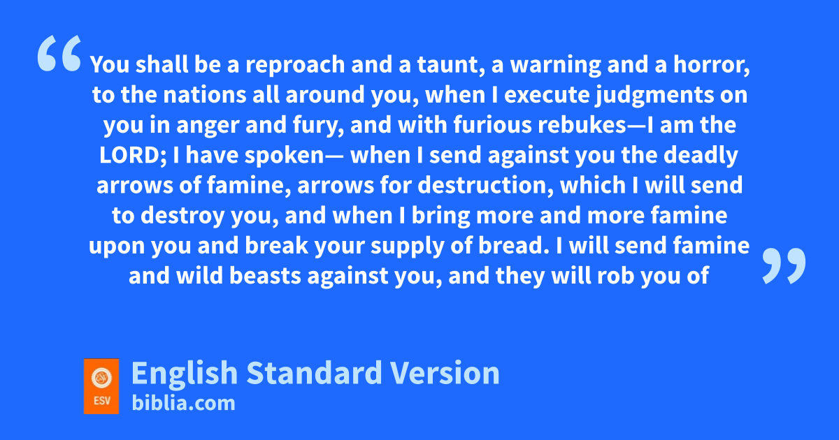 13 e“Thus shall my anger spend itself, and I will vent my fury upon them and satisfy myself. And they shall know that fI am the Lord—that I have spoken in my jealousy—ewhen I spend my fury upon them. 14 Moreover, I will make you ga desolation and han object of reproach among ithe nations all around you and in the sight of all who pass by. 15 You shall be4 a reproach and a taunt, a warning jand a horror, to ithe nations all around you, kwhen I execute judgments on you in anger and fury, and lwith furious rebukes—I am the Lord; I have spoken— 16 when I send against you5 mthe deadly arrows of famine, arrows for destruction, which I will send to destroy you, and when I bring more and more famine upon nyou and break your supply6 of bread. 17 I will send famine and owild beasts against you, pand they will rob you of your children. Pestilence and qblood shall pass through you, and I will bring the sword upon you. I am the Lord; I have spoken.”