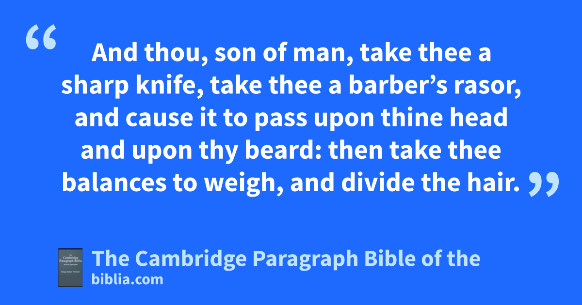 V. * And thou, son of man, atake thee ba sharp knife, take thee ca barber’s rasor, and dcause it to pass upon thine head and upon thy beard: then take thee balances to weigh, and divide the hair. 2 Thou shalt burn with fire ea third part in the midst of fthe city, when gthe days of the siege are fulfilled: and thou shalt take a third part, and smite about it with a knife: and a third part hthou shalt scatter in the wind; and iI will draw out a sword after them. 3 kThou shalt also take thereof a few in number, and bind them in thy * skirts. 4 lThen take of them again, and cast them into the midst of the fire, and burn them in the fire; for thereof shall a fire come forth into all the house of Israel.