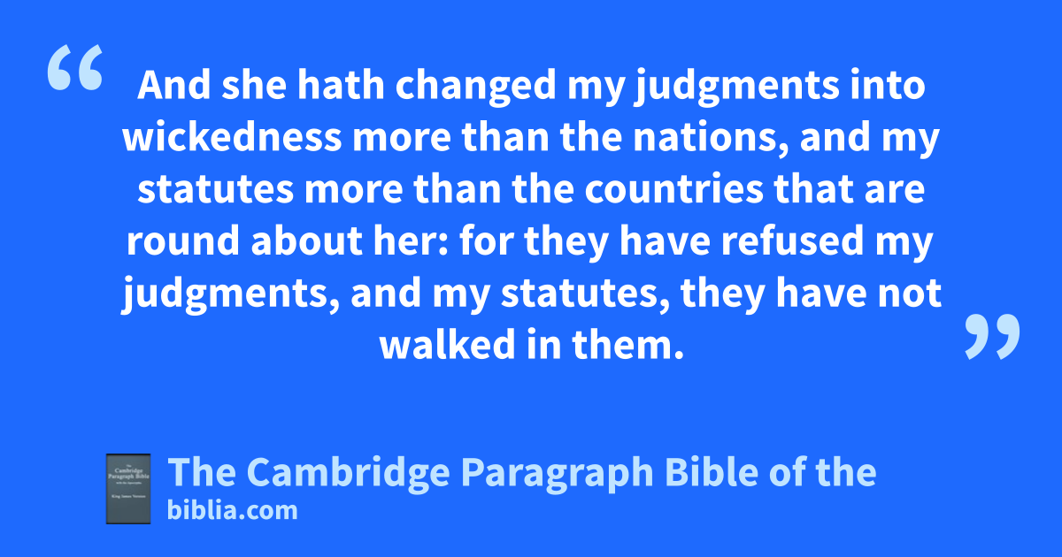5 Thus saith the Lord God; fThis is Jerusalem: I have set it in the midst of the nations and mcountries that are round about her. 6 And she nhath changed my judgments into wickedness more than the nations, and my statutes more than mthe countries that are round about her: for they have refused my judgments, and omy statutes, they have not walked in them. 7 Therefore thus saith the Lord God; Because ye pmultiplied more than the nations mthat are round about you, and ohave not walked in my statutes, neither have kept my judgments, qneither have done according to the judgments of the nations mthat are round about you; 8 therefore thus saith the Lord God; Behold, I, even I, am against thee, and qqwill execute judgments in the midst of thee in the sight of the nations. 9 And I will do in thee rthat which I have not done, and whereunto I will not do any more the like, because of all thine abominations. 10 Therefore sthe fathers shall eat the sons in the midst of thee, and sthe sons shall eat their fathers; and I will execute judgments in thee, and the whole remnant of thee will I tscatter into all the winds. 11 Wherefore, uas I live, saith the Lord God; Surely, because vthou hast defiled my sanctuary with all thy wdetestable things, and with all thine wabominations, therefore will I also xdiminish thee; yneither zshall mine eye spare, yneither will I have any pity. 12 A athird part of thee shall die with bthe pestilence, and with bfamine shall they be consumed in the midst of thee: and a third part shall fall by bthe sword round about thee; and cI will scatter a third part into all the winds, and dI will draw out a sword after them. 13 Thus eshall jmine anger be accomplished, and fI will cause jmy fury to rest upon them, and gI will be comforted: and they shall know that I the Lord hhave spoken it in ijmy zeal, ewhen I have accomplished my fury in them. 14 Moreover kI will make thee waste, and la reproach among the nations mthat are round about thee, nin the sight of all that pass by. 15 So it shall be la reproach and opa taunt, qan instruction and oran astonishment unto the nations mthat are round about thee, when I shall execute judgments in thee in anger and in fury and sin furious qrebukes. I the Lord have spoken it. 16 When I shall send upon them tthe evil arrows of famine, which shall be for their destruction, and which I will send to destroy you: and I will increase the famine upon you, and uwill break your staff of bread: 17 so will I send upon you vfamine and vwevil beasts, and they shall xbereave thee; and vypestilence and yblood shall pass through thee; and I will bring vthe sword upon thee. I the Lord have spoken it.