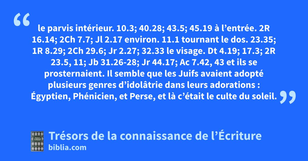 le parvis intérieur. 10.3; 40.28; 43.5; 45.19 à l’entrée. 2R 16.14; 2Ch 7.7; Jl 2.17 environ. 11.1 tournant le dos. 23.35; 1R 8.29; 2Ch 29.6; Jr 2.27; 32.33 le visage. Dt 4.19; 17.3; 2R 23.5, 11; Jb 31.26-28; Jr 44.17; Ac 7.42, 43 et ils se prosternaient. Il semble que les Juifs avaient adopté plusieurs genres d’idolâtrie dans leurs adorations : Égyptien, Phénicien, et Perse, et là c’était le culte du soleil.