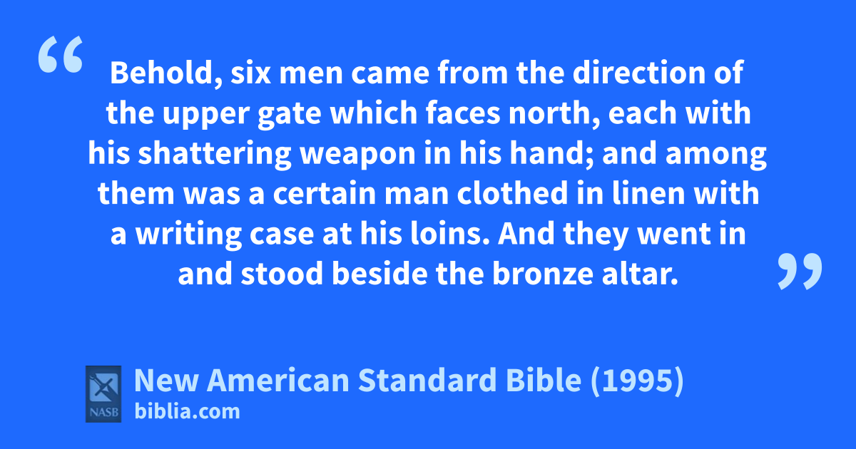 2 Behold, six men came from the direction of the upper gate which faces north, each with his shattering weapon in his hand; and among them was aa certain man clothed in linen with a 1writing case at his loins. And they went in and stood beside the bronze altar.