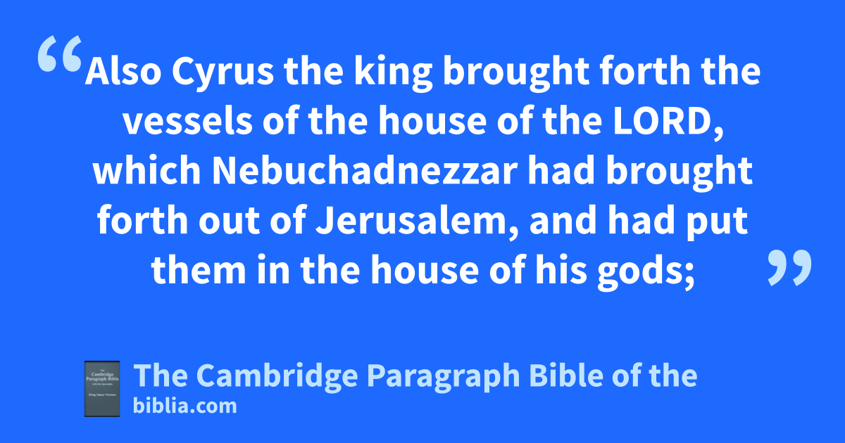 5 Then rose up the chief of the fathers of Judah and Benjamin, and the priests, and the Levites, with all them whose spirit eGod had fraised, to go up to build the house of the Lord which is in Jerusalem. 6 And all they that were about them * strengthened their hands with vessels of silver, with gold, with goods, and with beasts, and with gprecious things, beside all that was willingly offered. 7 hAlso Cyrus the king brought forth the vessels of the house of the Lord, iwhich Nebuchadnezzar had brought forth out of Jerusalem, and had put them in the house of his gods; 8 even those did Cyrus king of Persia bring forth jby the hand of kMithredath the ltreasurer, and numbered them unto mSheshbazzar, the prince of Judah. 9 And this is the number of them: thirty chargers of gold, a thousand chargers of silver, nine and twenty nknives, 10 thirty obasons of gold, silver basons of a second sort nfour hundred and ten, and other vessels a thousand. 11 All the vessels of gold and of silver were pfive thousand and four hundred. All these did Sheshbazzar bring up with them of * the captivity that were brought up from Babylon unto Jerusalem.