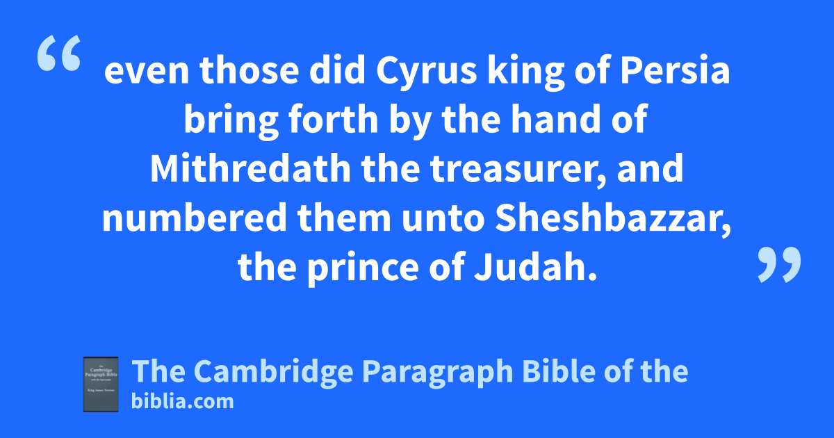 5 Then rose up the chief of the fathers of Judah and Benjamin, and the priests, and the Levites, with all them whose spirit eGod had fraised, to go up to build the house of the Lord which is in Jerusalem. 6 And all they that were about them * strengthened their hands with vessels of silver, with gold, with goods, and with beasts, and with gprecious things, beside all that was willingly offered. 7 hAlso Cyrus the king brought forth the vessels of the house of the Lord, iwhich Nebuchadnezzar had brought forth out of Jerusalem, and had put them in the house of his gods; 8 even those did Cyrus king of Persia bring forth jby the hand of kMithredath the ltreasurer, and numbered them unto mSheshbazzar, the prince of Judah. 9 And this is the number of them: thirty chargers of gold, a thousand chargers of silver, nine and twenty nknives, 10 thirty obasons of gold, silver basons of a second sort nfour hundred and ten, and other vessels a thousand. 11 All the vessels of gold and of silver were pfive thousand and four hundred. All these did Sheshbazzar bring up with them of * the captivity that were brought up from Babylon unto Jerusalem.