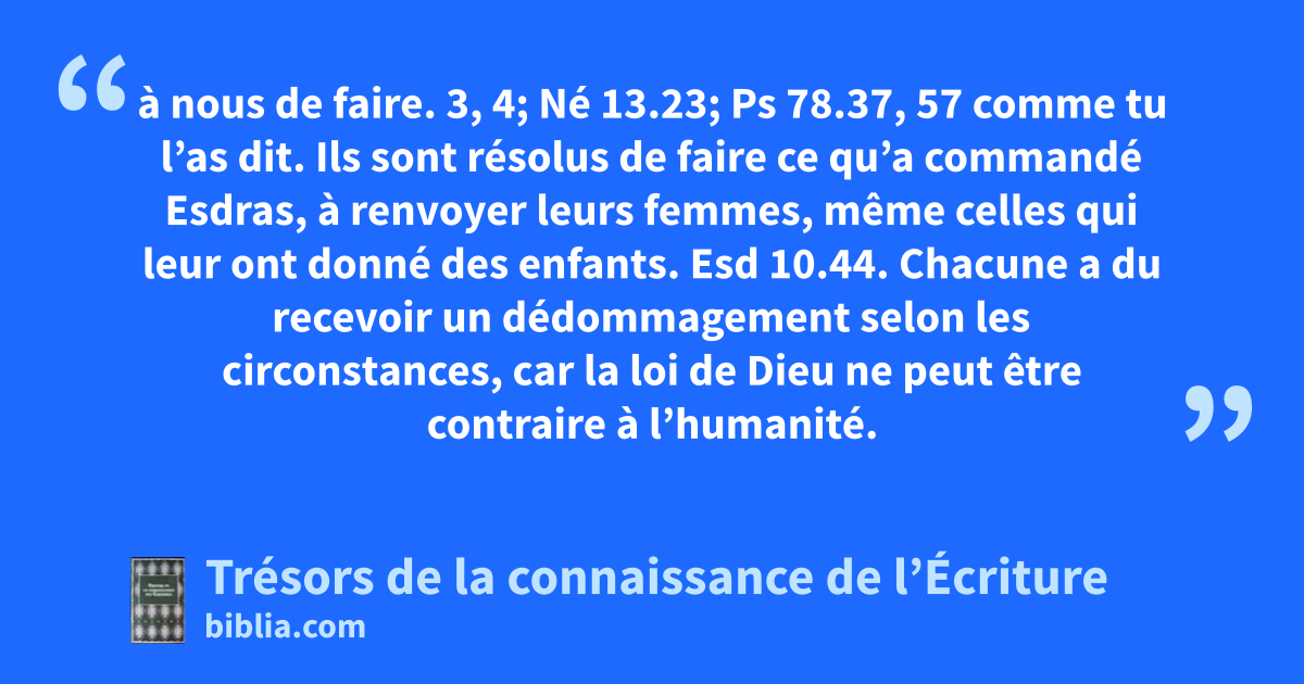 à nous de faire. 3, 4; Né 13.23; Ps 78.37, 57 comme tu l’as dit. Ils sont résolus de faire ce qu’a commandé Esdras, à renvoyer leurs femmes, même celles qui leur ont donné des enfants. Esd 10.44. Chacune a du recevoir un dédommagement selon les circonstances, car la loi de Dieu ne peut être contraire à l’humanité.