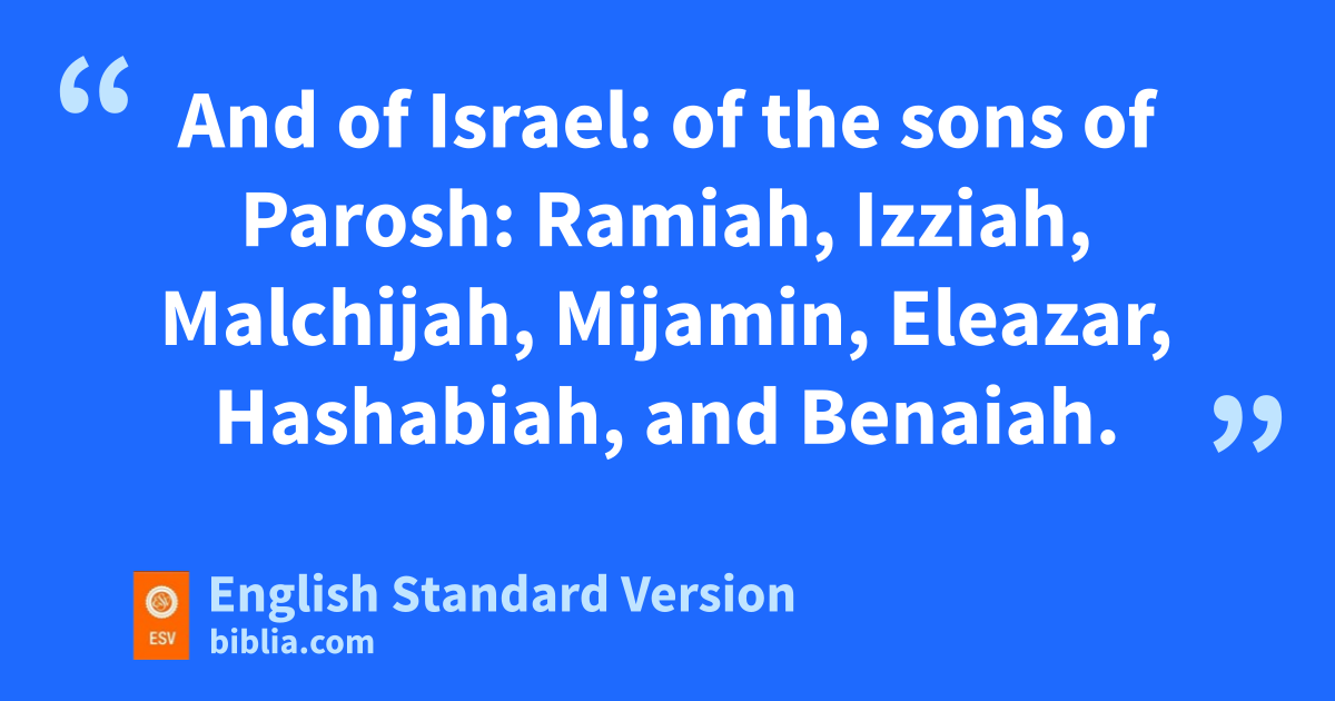 25 And of Israel: of the sons of Parosh: Ramiah, Izziah, Malchijah, Mijamin, Eleazar, Hashabiah,5 and Benaiah. 26 Of the sons of Elam: Mattaniah, Zechariah, Jehiel, Abdi, Jeremoth, and Elijah. 27 Of the sons of Zattu: Elioenai, Eliashib, Mattaniah, Jeremoth, Zabad, and Aziza. 28 Of the sons of Bebai were Jehohanan, Hananiah, Zabbai, and Athlai. 29 Of the sons of Bani were Meshullam, Malluch, Adaiah, Jashub, Sheal, and Jeremoth. 30 Of the sons of Pahath-moab: Adna, Chelal, Benaiah, Maaseiah, Mattaniah, Bezalel, Binnui, and Manasseh. 31 Of the lsons of Harim: Eliezer, Isshijah, Malchijah, Shemaiah, Shimeon, 32 Benjamin, Malluch, and Shemariah. 33 Of the sons of Hashum: Mattenai, Mattattah, Zabad, Eliphelet, Jeremai, Manasseh, and Shimei. 34 Of the sons of mBani: Maadai, Amram, Uel, 35 Benaiah, Bedeiah, Cheluhi, 36 Vaniah, Meremoth, Eliashib, 37 Mattaniah, Mattenai, Jaasu. 38 Of the sons of Binnui:6 Shimei, 39 Shelemiah, Nathan, Adaiah, 40 Machnadebai, Shashai, Sharai, 41 Azarel, Shelemiah, Shemariah, 42 Shallum, Amariah, and Joseph. 43 Of the sons of Nebo: Jeiel, Mattithiah, Zabad, Zebina, Jaddai, Joel, and Benaiah. 44 All these had married foreign women, and some of the women nhad even borne children.7