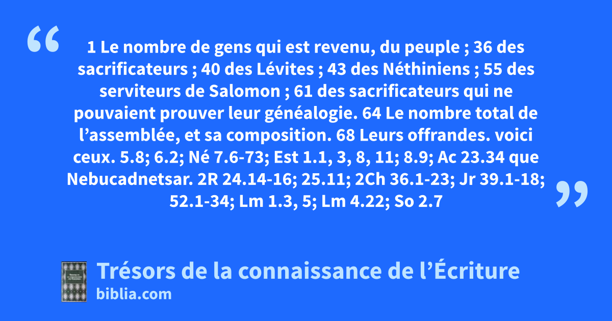 1 Le nombre de gens qui est revenu, du peuple ; 36 des sacrificateurs ; 40 des Lévites ; 43 des Néthiniens ; 55 des serviteurs de Salomon ; 61 des sacrificateurs qui ne pouvaient prouver leur généalogie. 64 Le nombre total de l’assemblée, et sa composition. 68 Leurs offrandes.