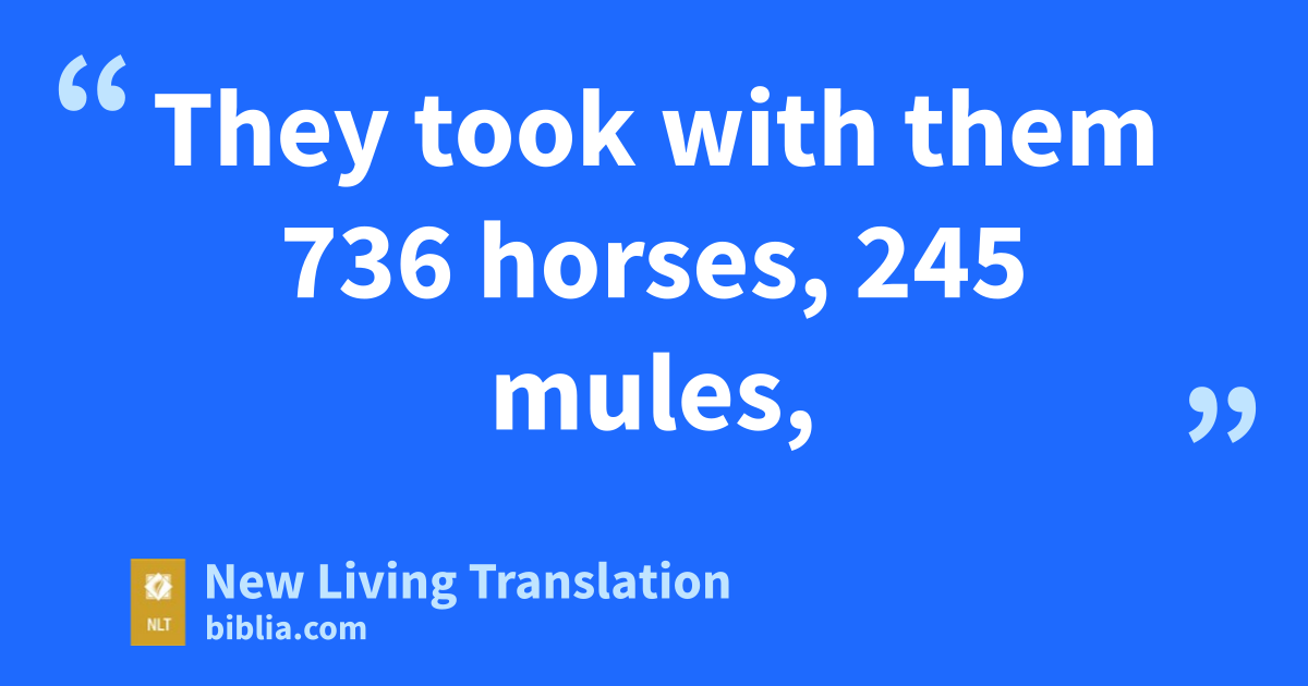 64 So a total of 42,360 people returned to Judah, 65 in addition to 7,337 servants and 200 singers, both men and women. 66 They took with them 736 horses, 245 mules, 67 435 camels, and 6,720 donkeys.