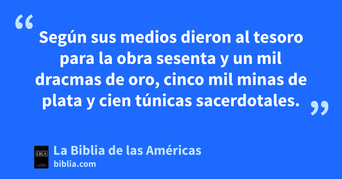 69 Según sus medios dieron al tesoro para la obra sesenta y un mil dracmas1 de oro, cinco mil minas2 de plataa y cien túnicas sacerdotales.