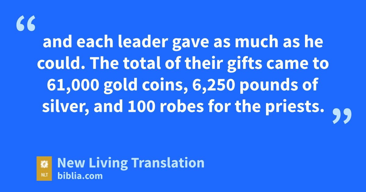68 When they arrived at the Temple of the Lord in Jerusalem, some of the family leaders made voluntary offerings toward the rebuilding of God’s Temple on its original site, 69 and each leader gave as much as he could. The total of their gifts came to 61,000 gold coins,* 6,250 pounds* of silver, and 100 robes for the priests.