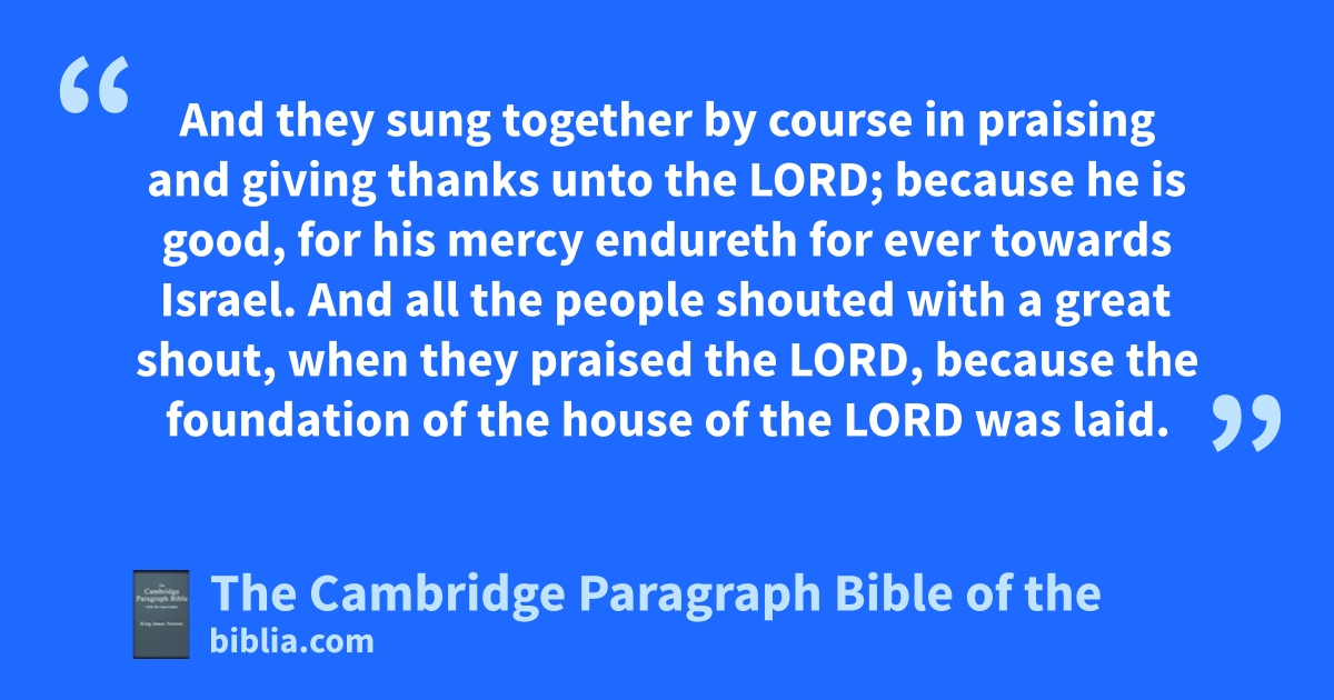 8 * Now in the second year of their coming unto the house of God at Jerusalem, in the second month, began pZerubbabel the son of Shealtiel, and pJeshua the son of Jozadak, and the remnant of their brethren the priests and the Levites, and all they that were come out of the captivity unto Jerusalem; and appointed the Levites from qtwenty years old and upward, rto set forward the work of the house of the Lord. 9 Then stood sJeshua with his sons and his brethren, sKadmiel and his sons, the sons of * Judah, * together, rto set forward the workmen in the house of God: the sons of tHenadad, with their sons and their brethren the Levites. 10 And when the builders laid the foundation of the temple of the Lord, they set the priests uin their apparel with wtrumpets, and the Levites the sons of Asaph with xcymbals, to praise the Lord, yafter the ordinance of David king of Israel. 11 And they zsung together by course in praising and giving thanks unto the Lord; abecause he is good, for his mercy endureth for ever towards Israel. And all the people shouted with a great shout, when they praised the Lord, because the foundation of the house of the Lord was laid. 12 But many of the priests and Levites and chief of the fathers, who were ancient men bthat had seen the first house, when the foundation of this house was laid before their eyes, wept with a loud voice; and many shouted aloud for joy: 13 so that the people could not discern the noise of the shout of joy from the noise of the weeping of the people: for the people shouted with a loud shout, and the noise was heard afar off.